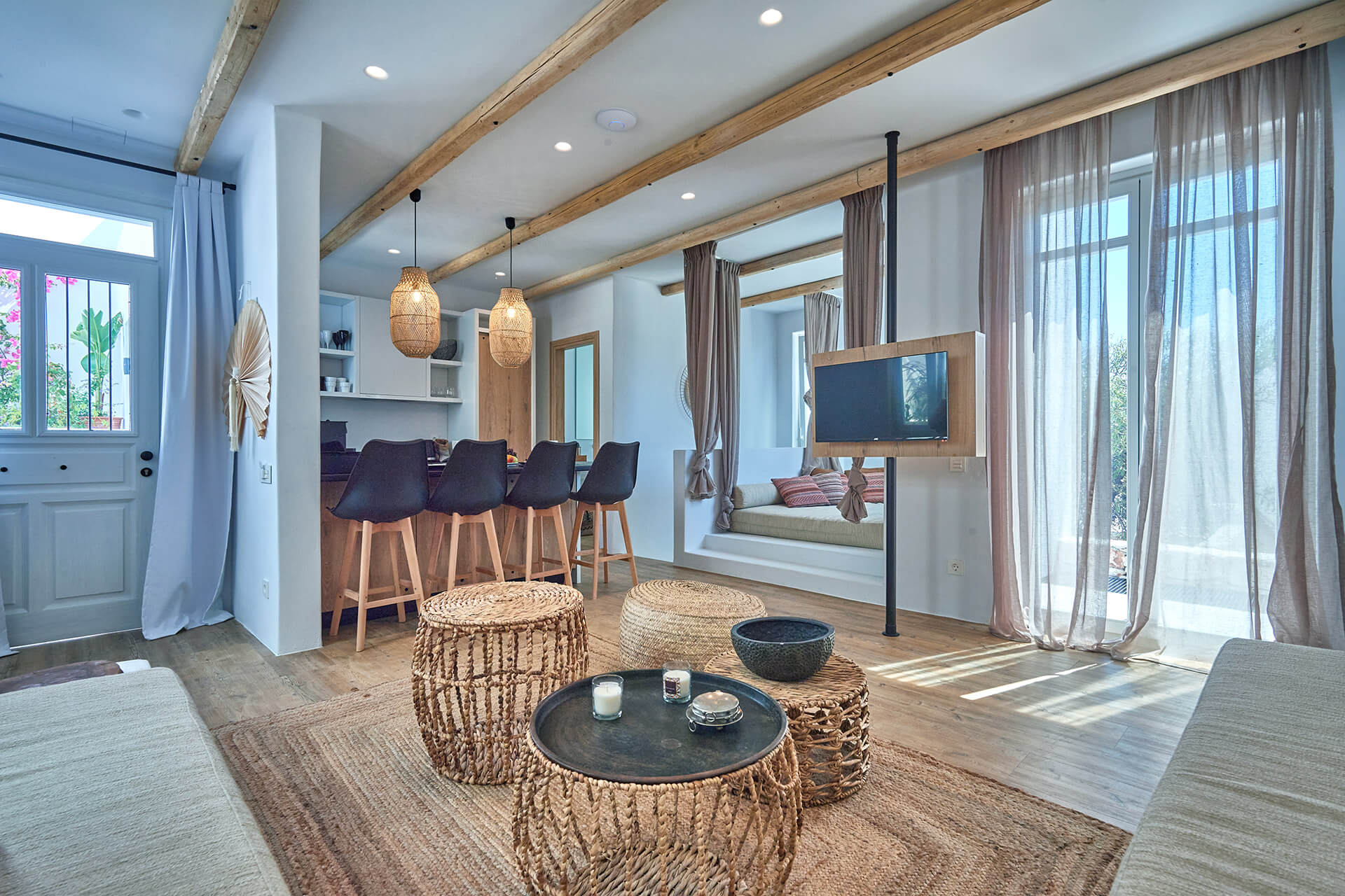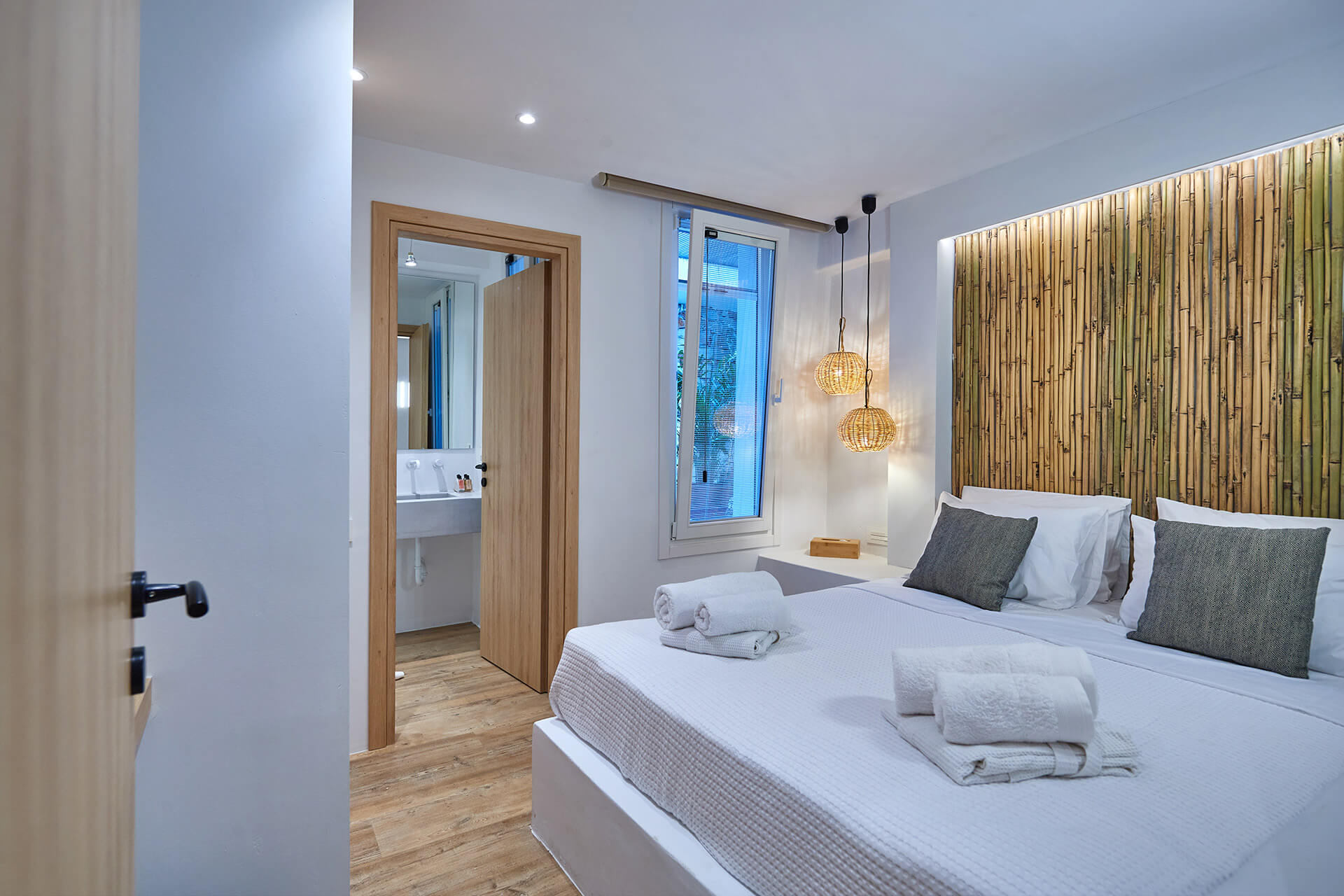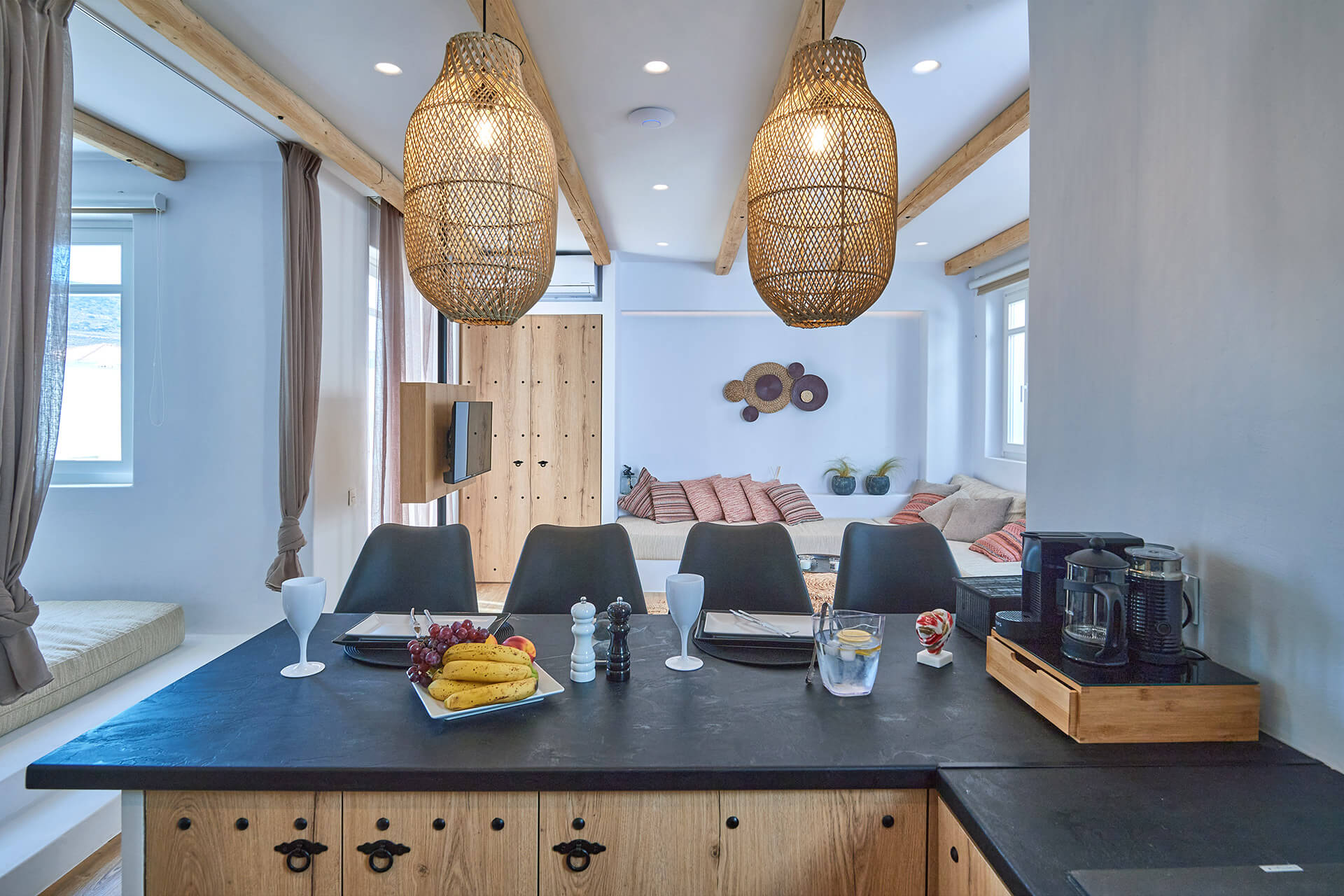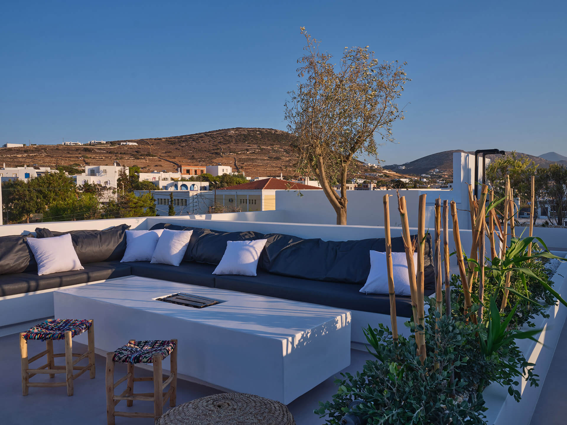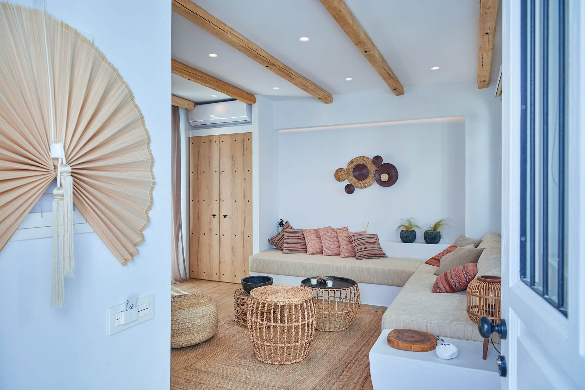 Bamboo, wooden elements, white and dark surfaces, and beautiful Cycladic windows combine modern aesthetics with island tradition to create a cinematic landscape. Inhale the fresh Mediterranean air as you sip a refreshing cocktail, read a good book, or simply indulge in the luxury of doing nothing in your private lounge area of the terrace.