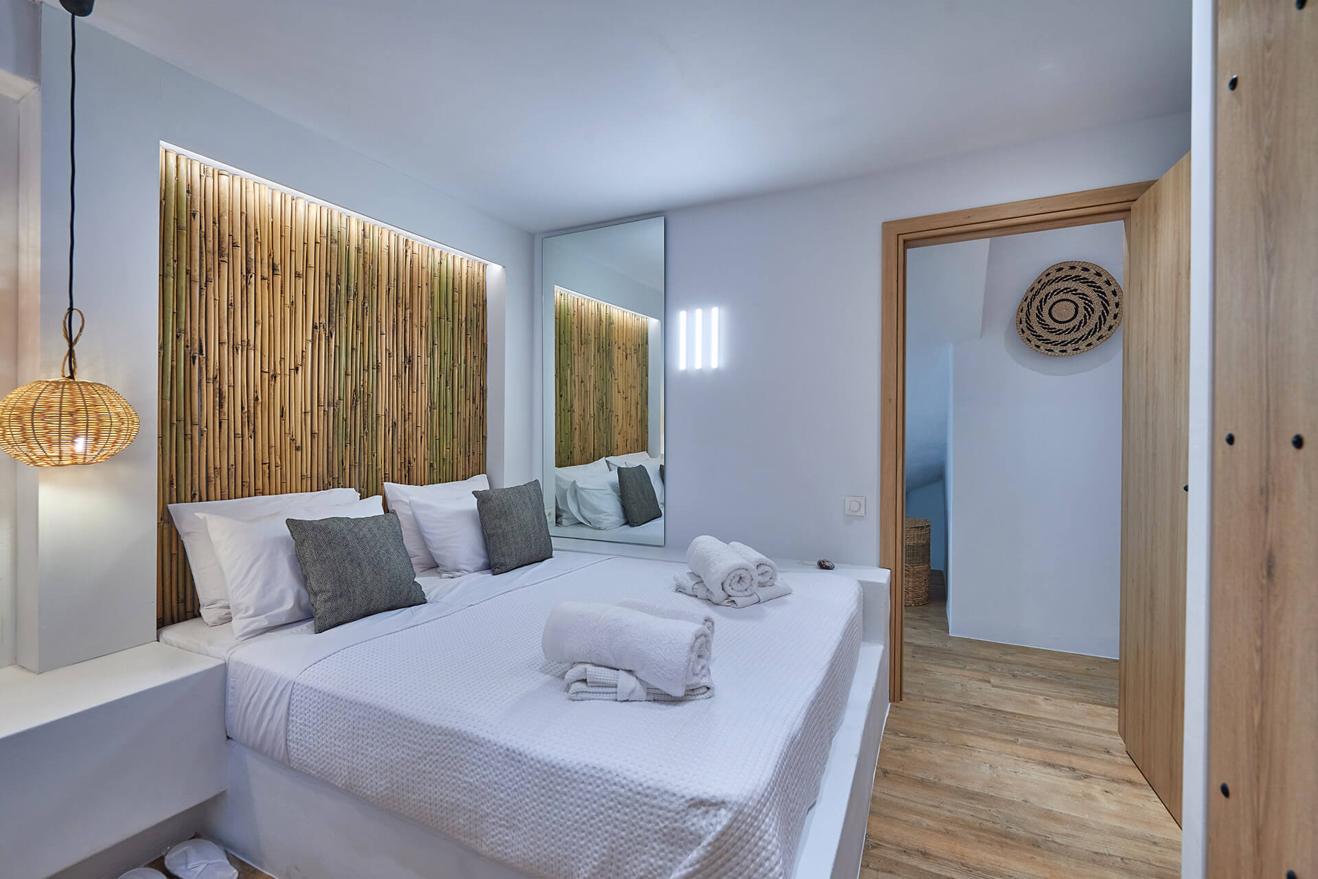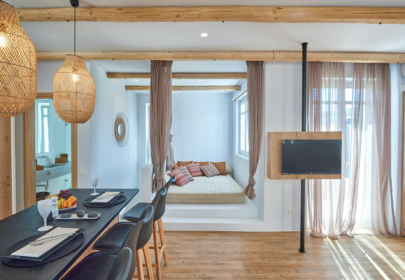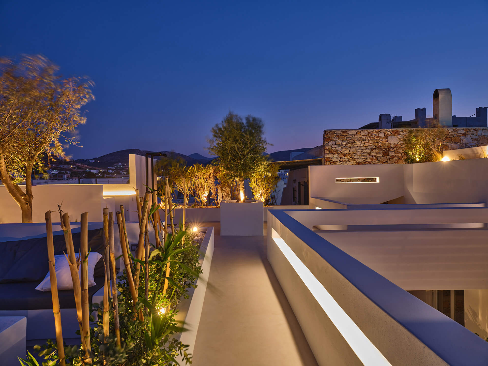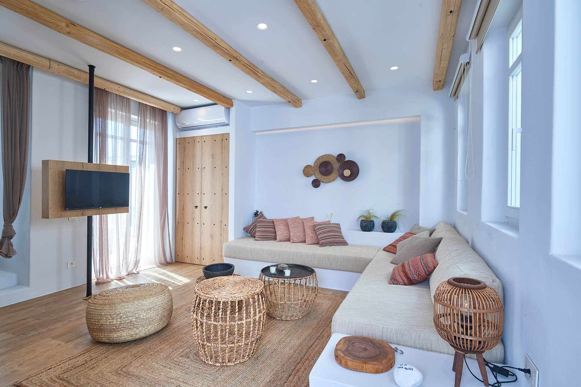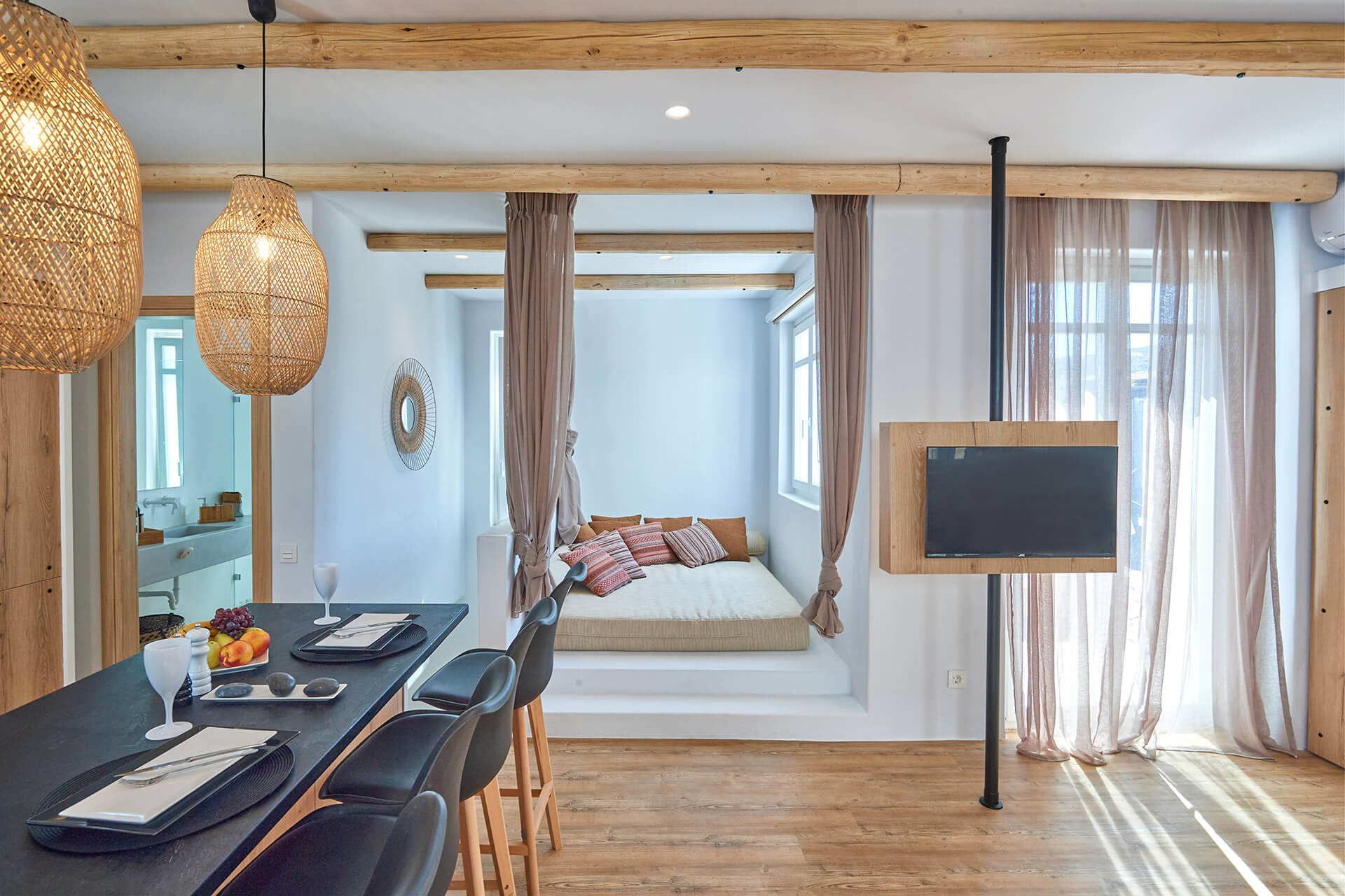 Bamboo, wooden elements, white and dark surfaces, and beautiful Cycladic windows combine modern aesthetics with island tradition to create a cinematic landscape. Inhale the fresh Mediterranean air as you sip a refreshing cocktail, read a good book, or simply indulge in the luxury of doing nothing in your private lounge area of the terrace.