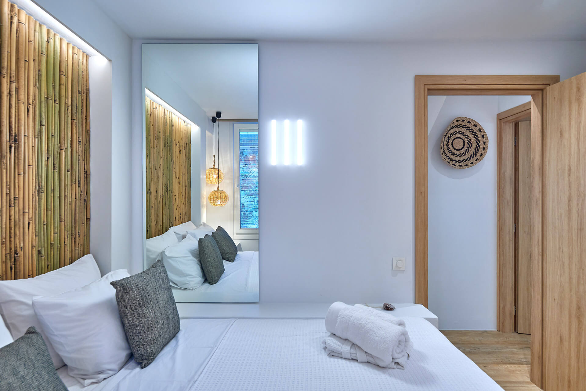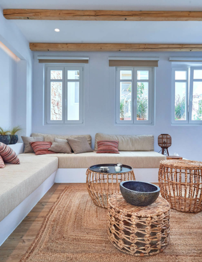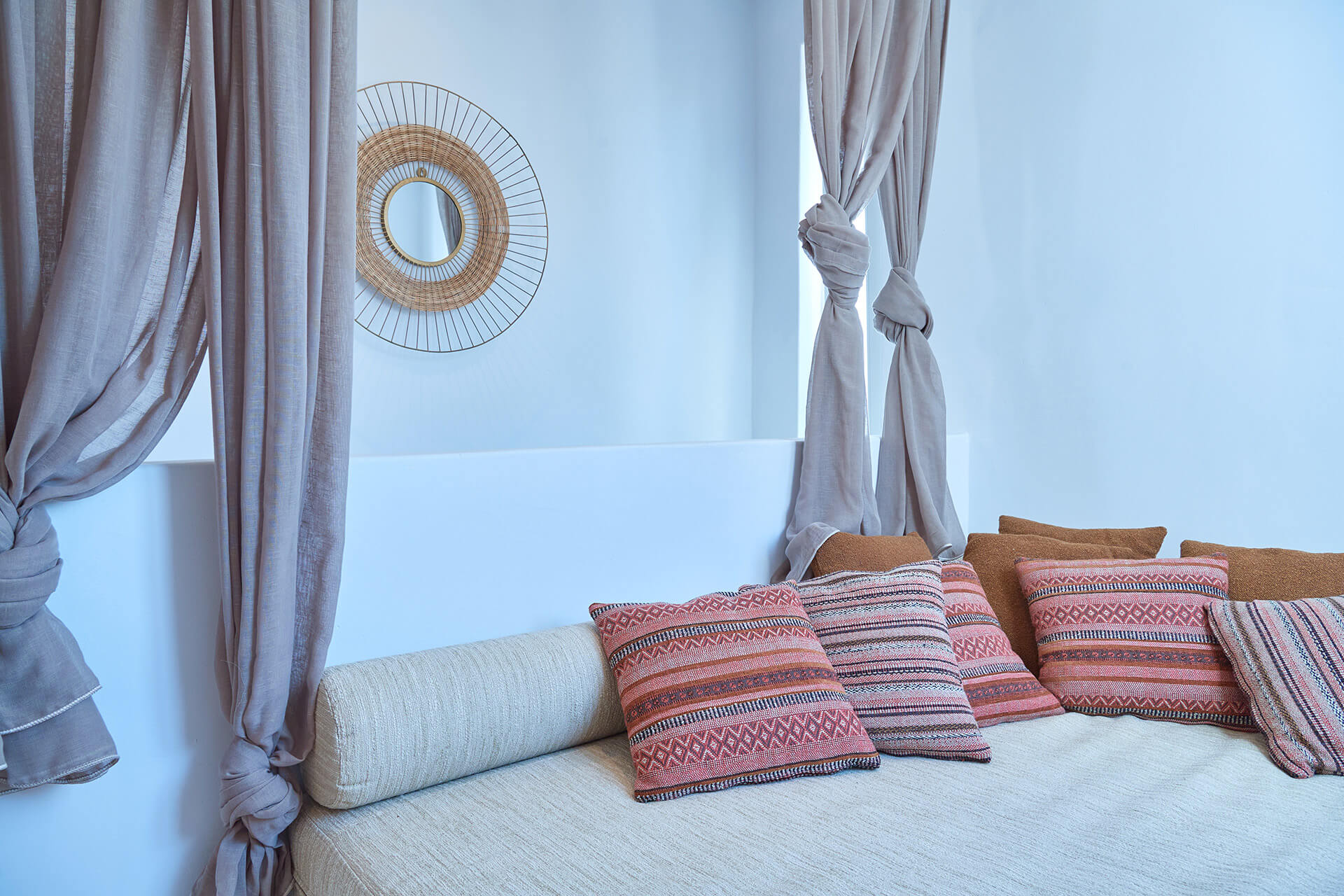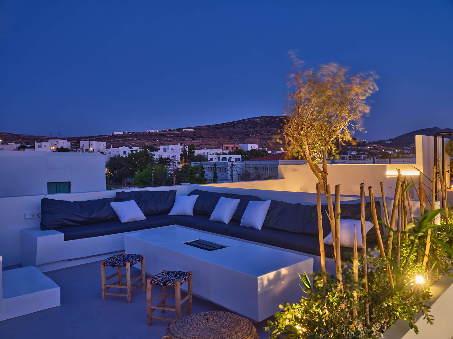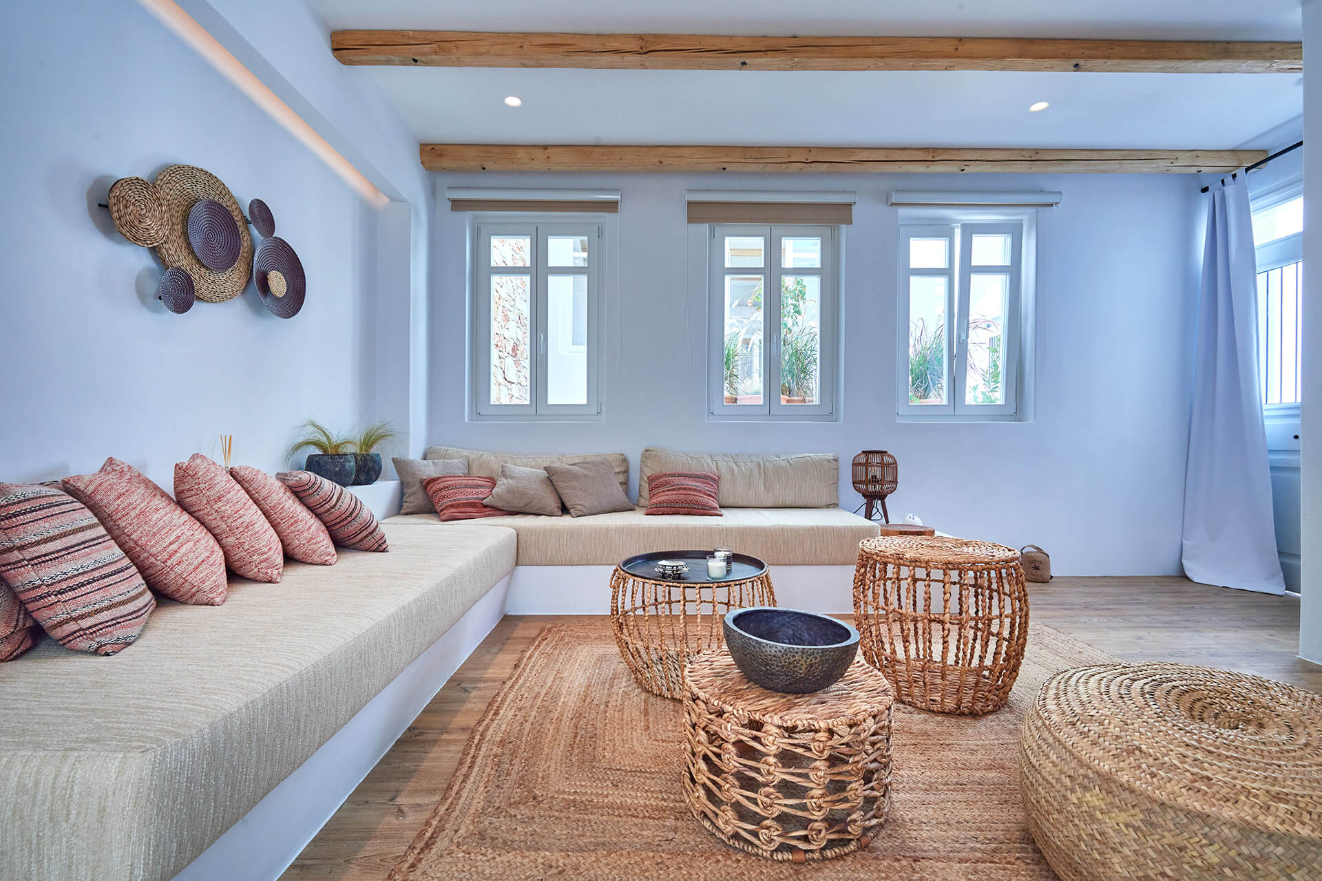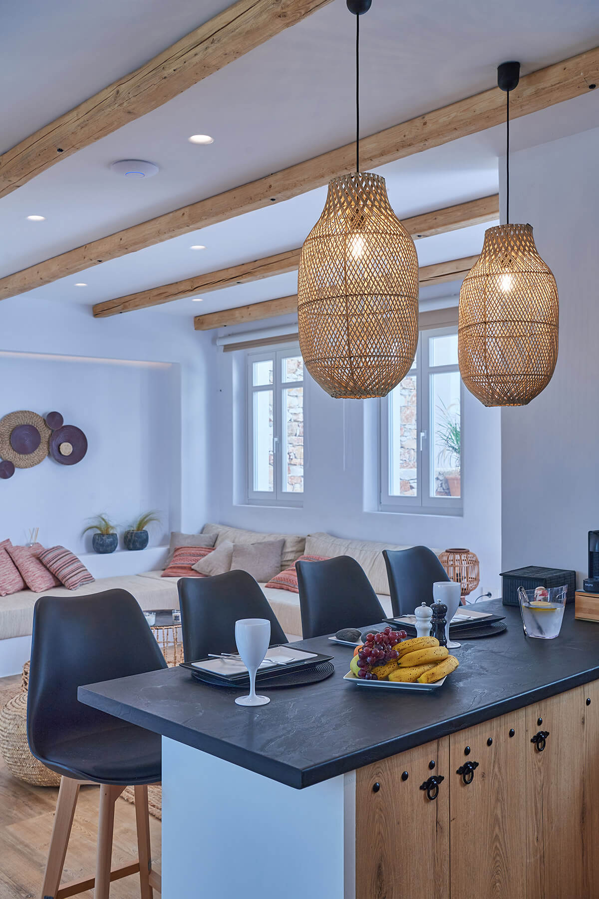 Bamboo, wooden elements, white and dark surfaces, and beautiful Cycladic windows combine modern aesthetics with island tradition to create a cinematic landscape. Inhale the fresh Mediterranean air as you sip a refreshing cocktail, read a good book, or simply indulge in the luxury of doing nothing in your private lounge area of the terrace.