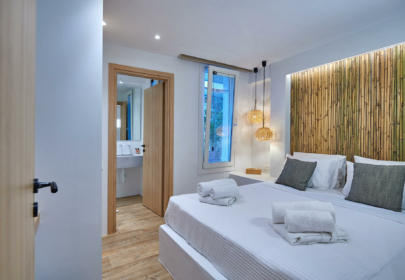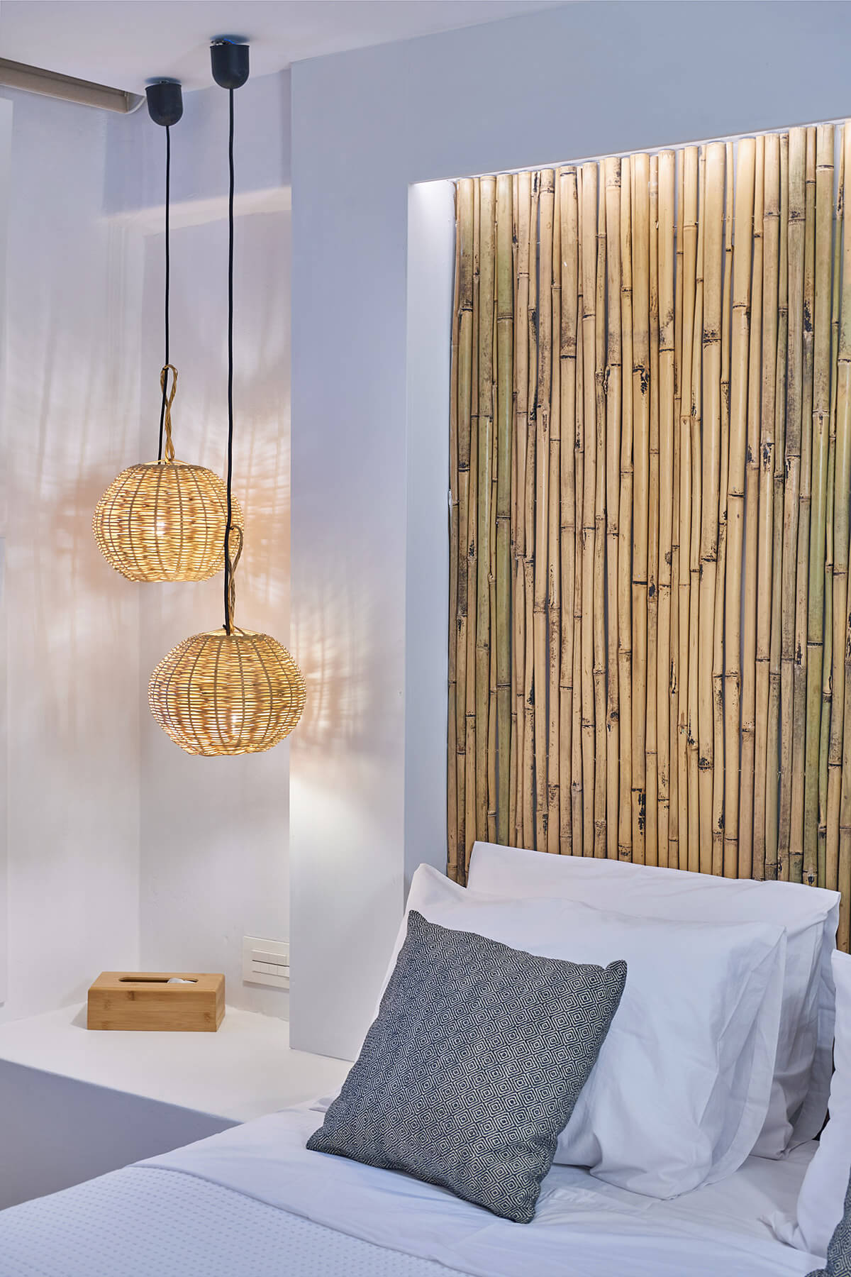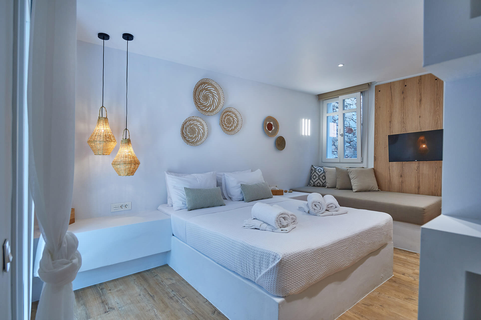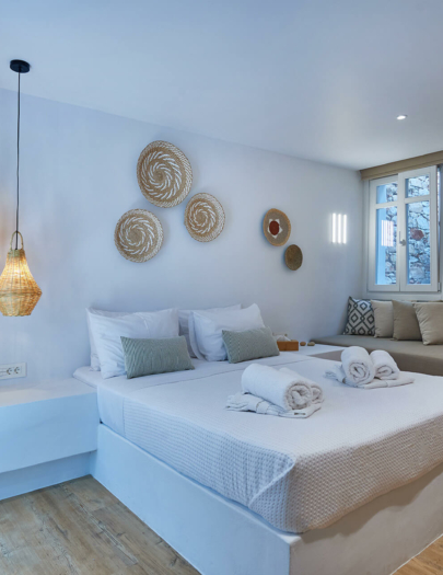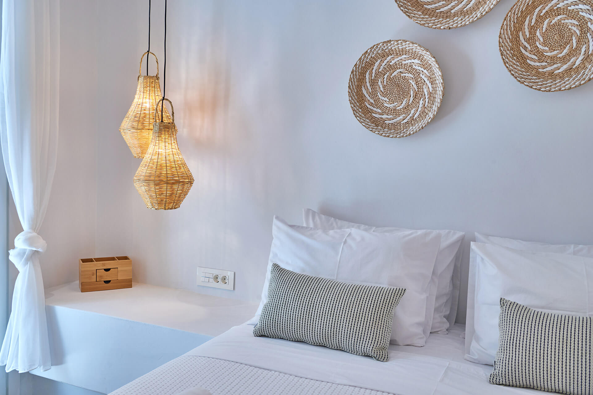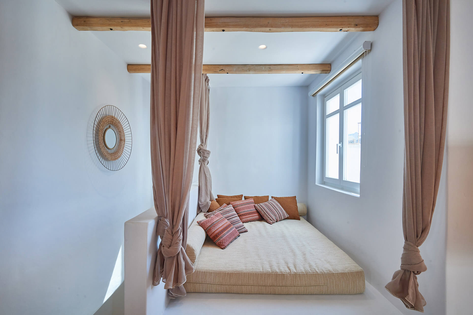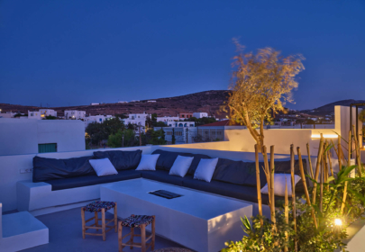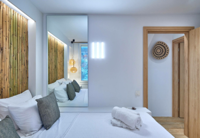 Bamboo, wooden elements, white and dark surfaces, and beautiful Cycladic windows combine modern aesthetics with island tradition to create a cinematic landscape. Inhale the fresh Mediterranean air as you sip a refreshing cocktail, read a good book, or simply indulge in the luxury of doing nothing in your private lounge area of the terrace.