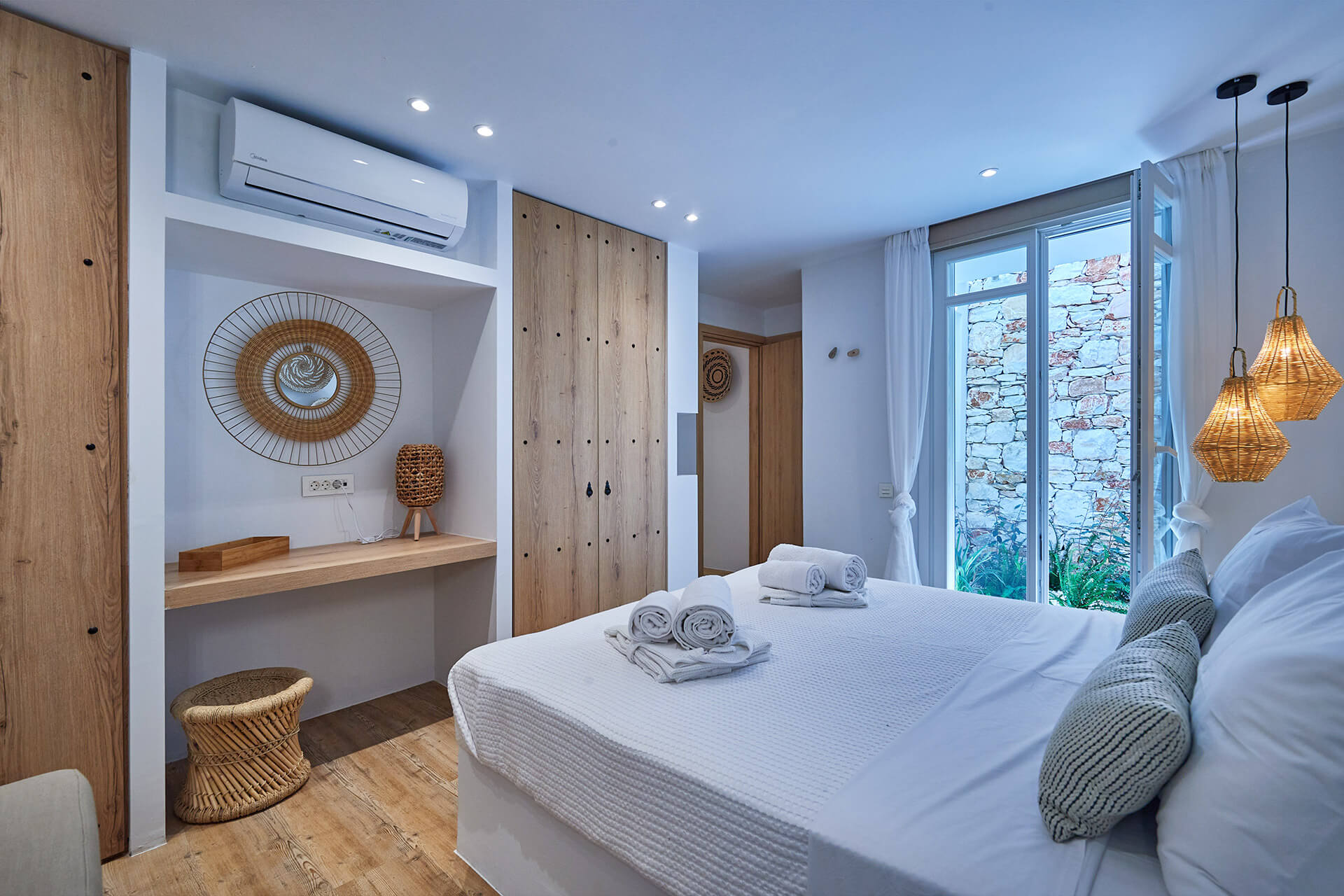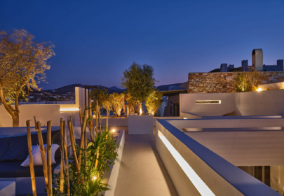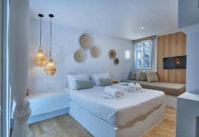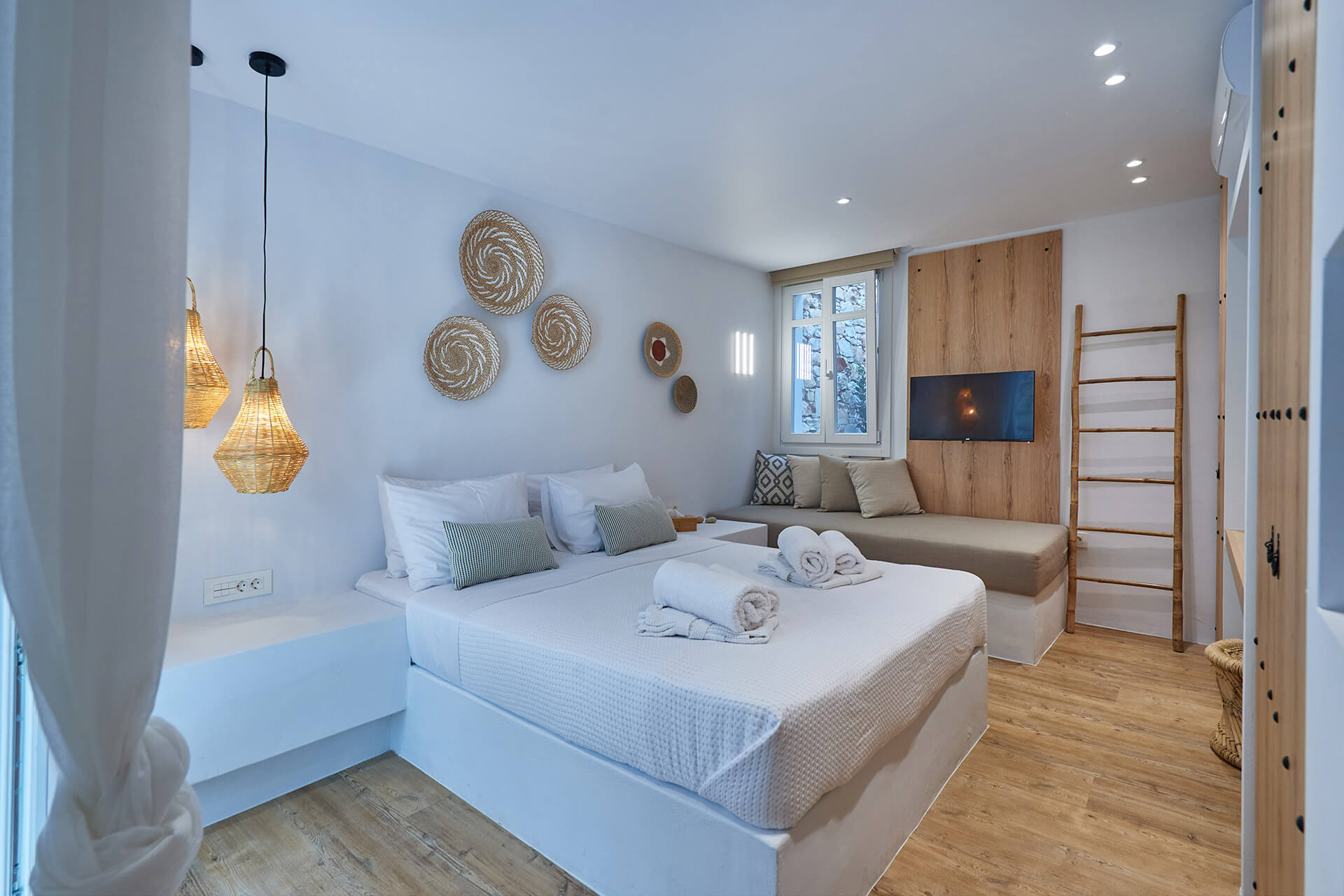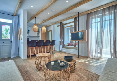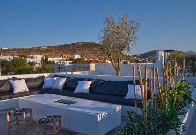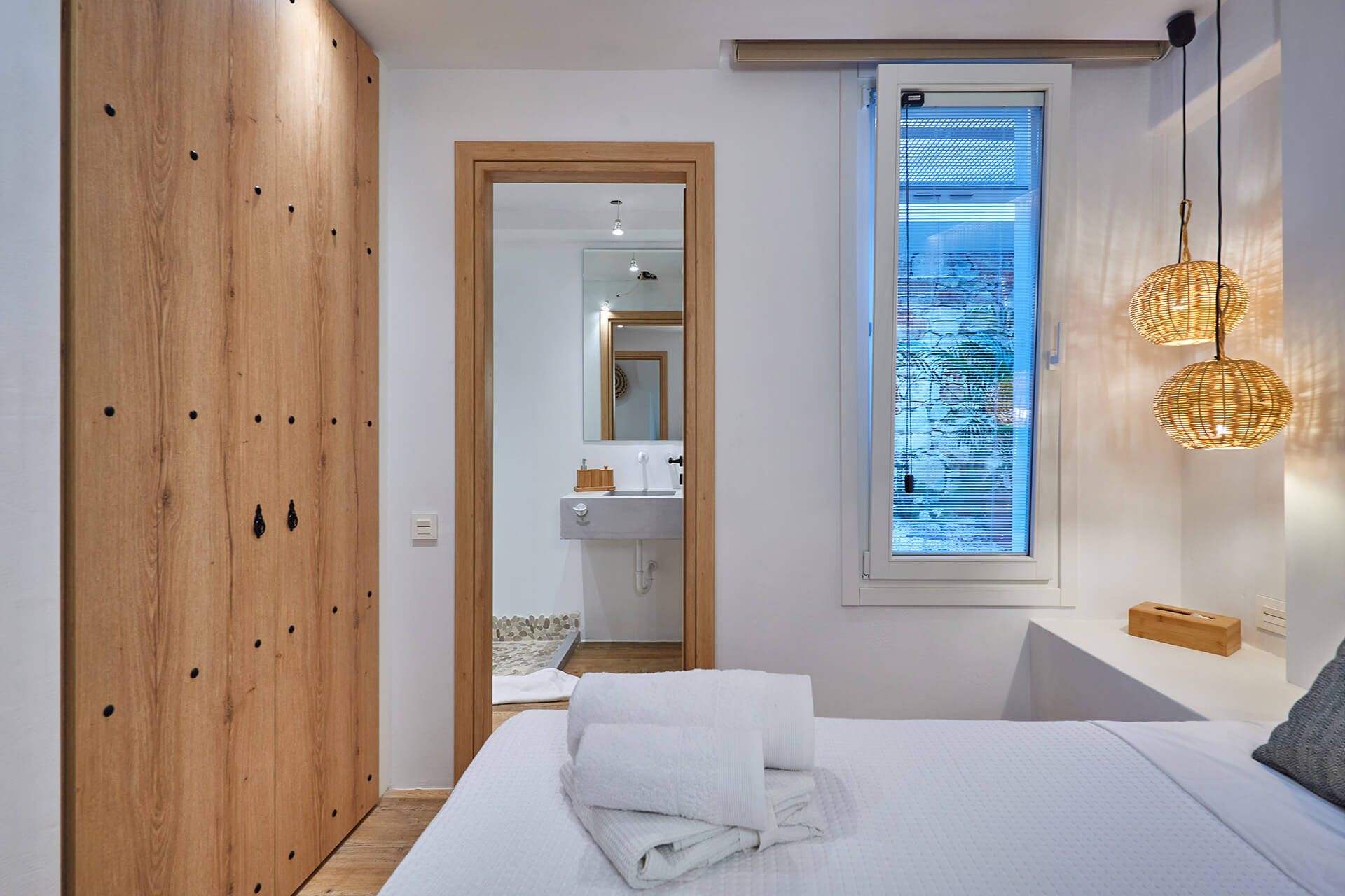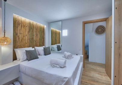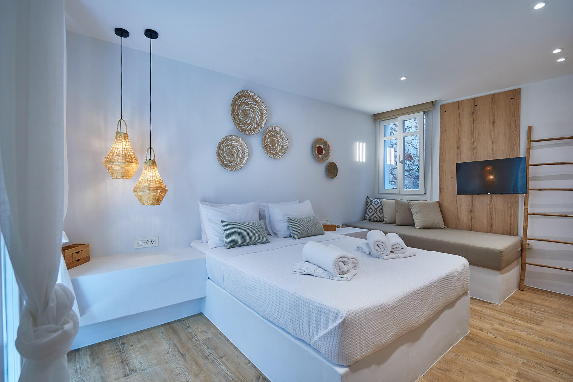 Bamboo, wooden elements, white and dark surfaces, and beautiful Cycladic windows combine modern aesthetics with island tradition to create a cinematic landscape. Inhale the fresh Mediterranean air as you sip a refreshing cocktail, read a good book, or simply indulge in the luxury of doing nothing in your private lounge area of the terrace.