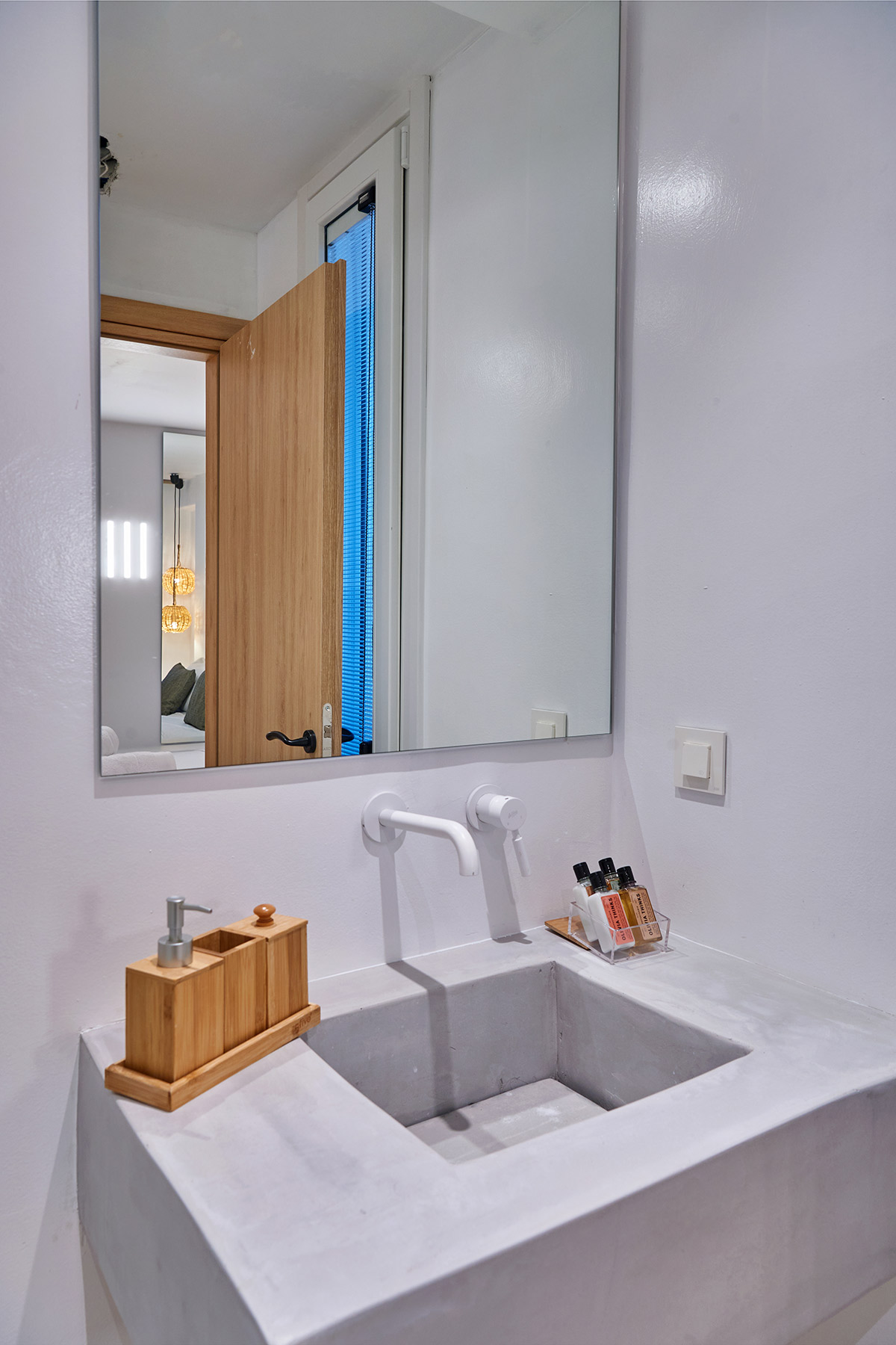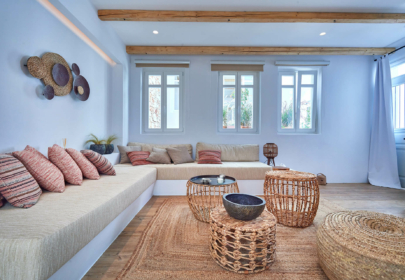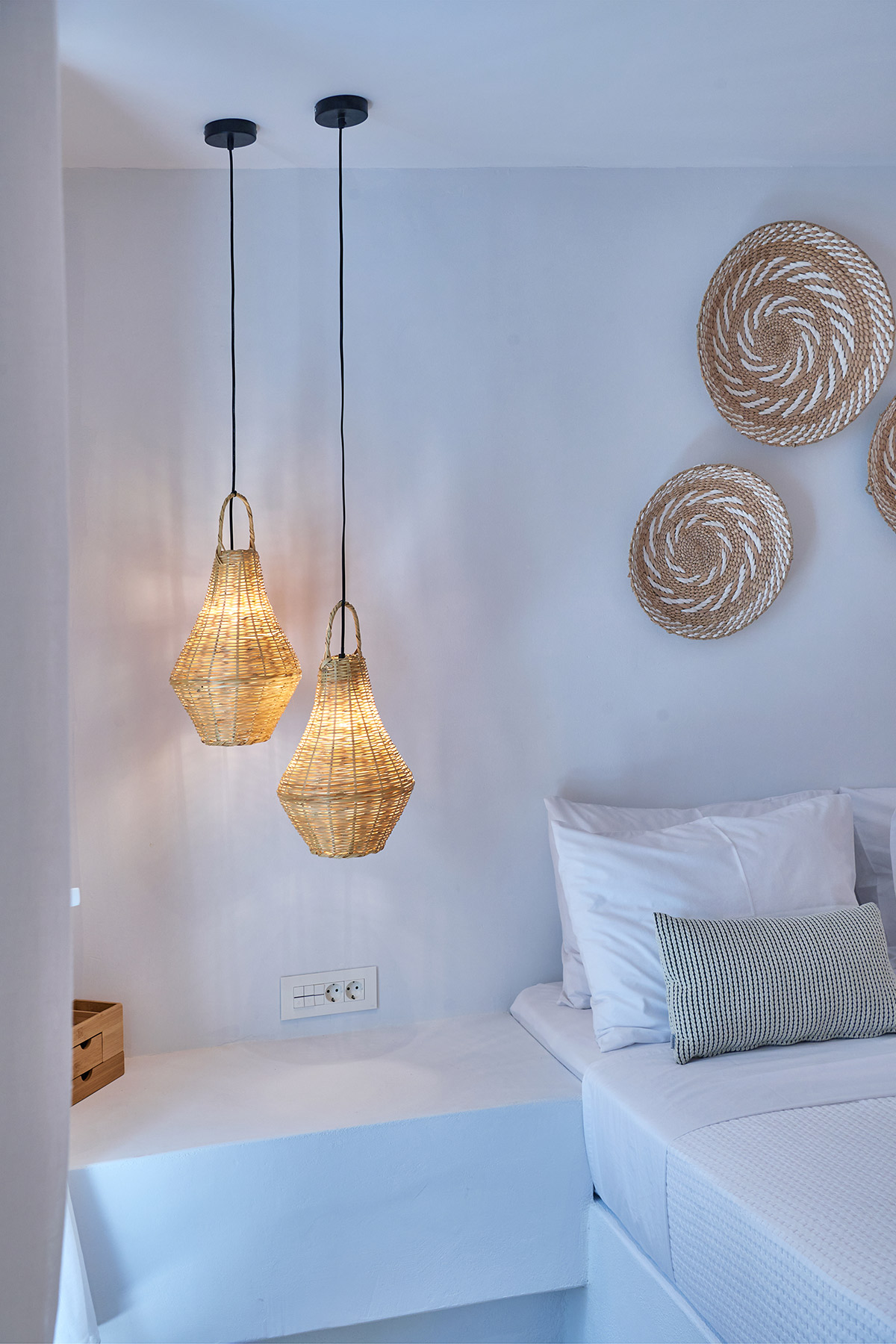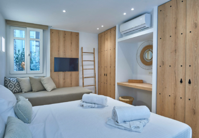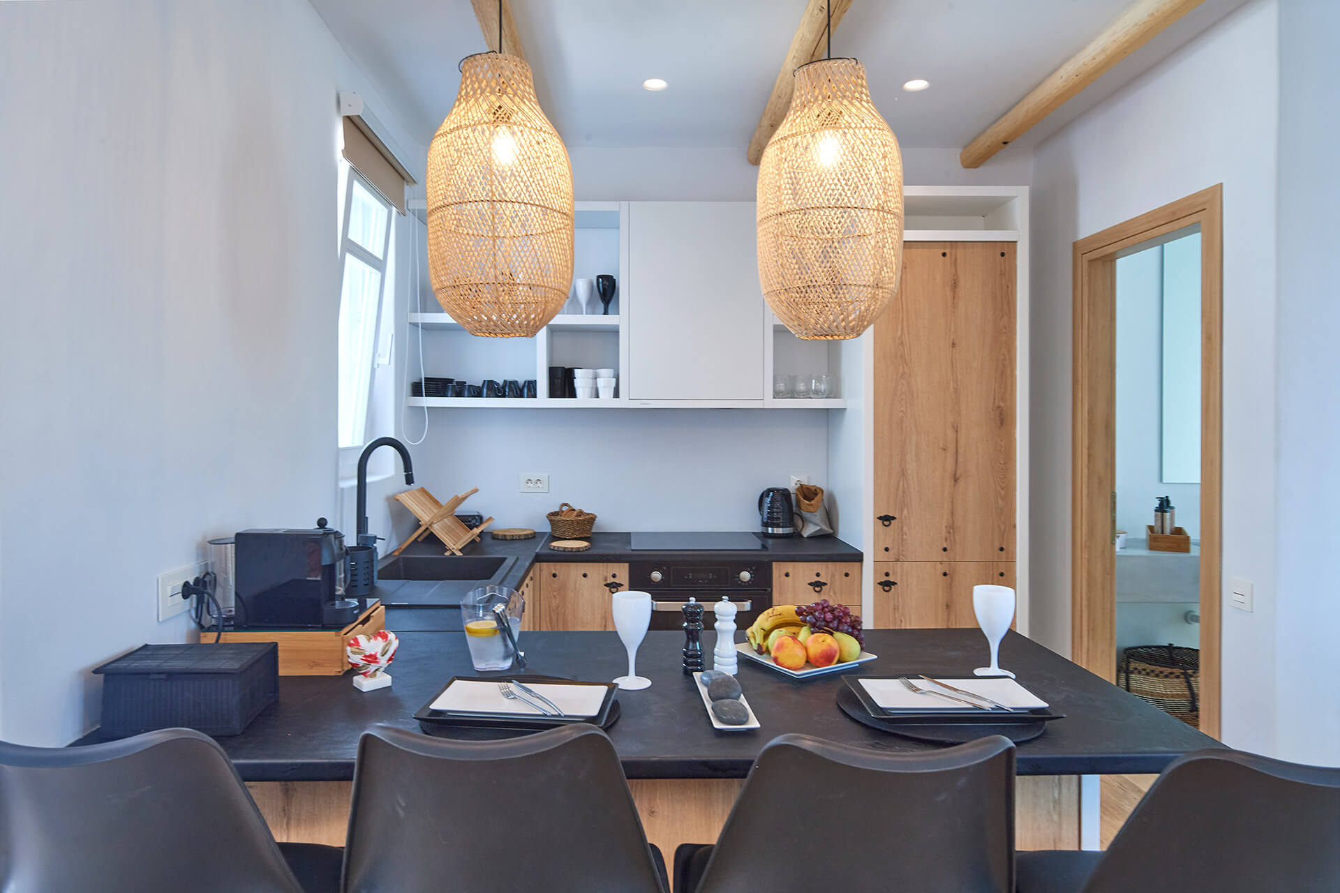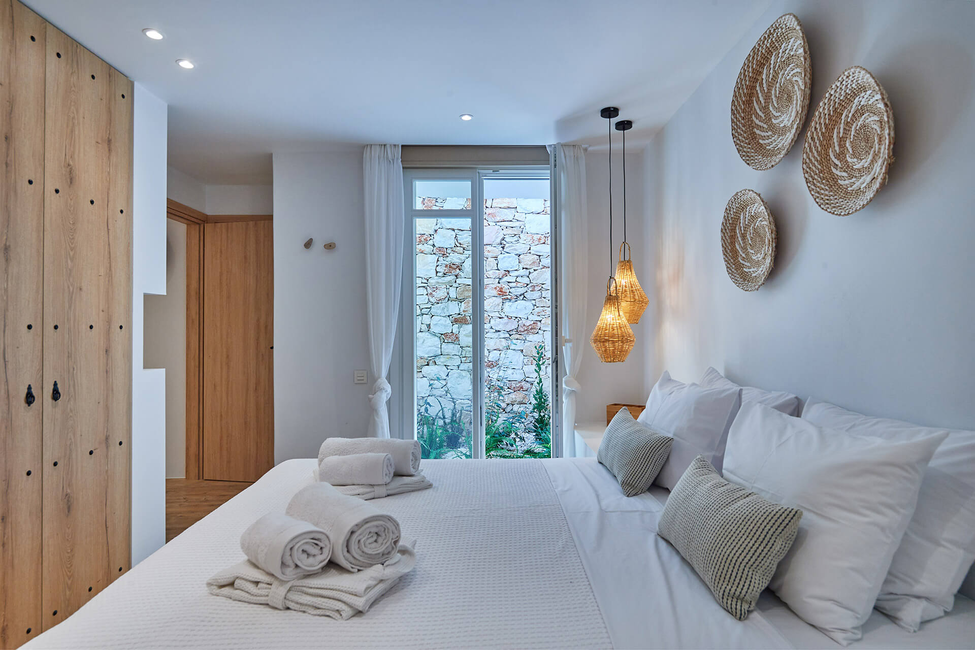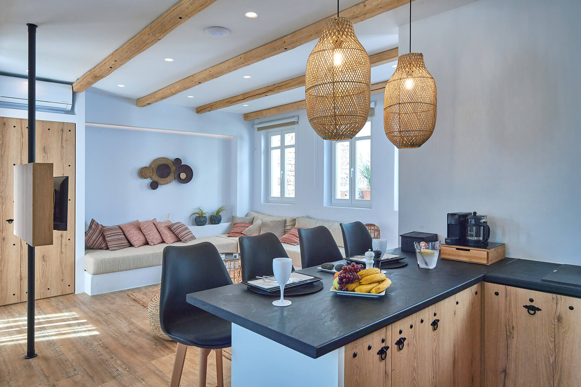 Bamboo, wooden elements, white and dark surfaces, and beautiful Cycladic windows combine modern aesthetics with island tradition to create a cinematic landscape. Inhale the fresh Mediterranean air as you sip a refreshing cocktail, read a good book, or simply indulge in the luxury of doing nothing in your private lounge area of the terrace.