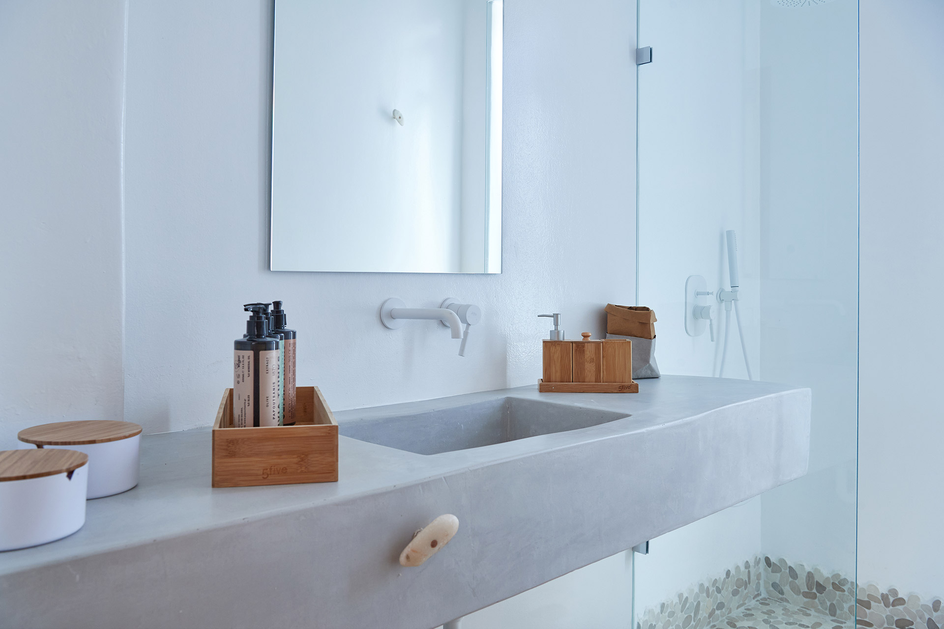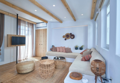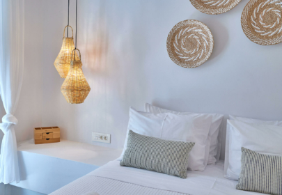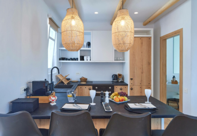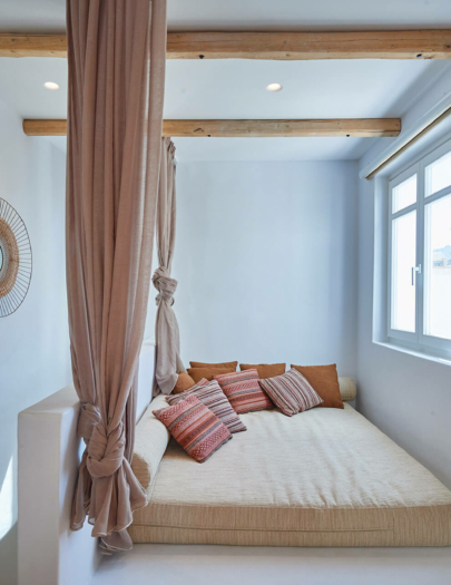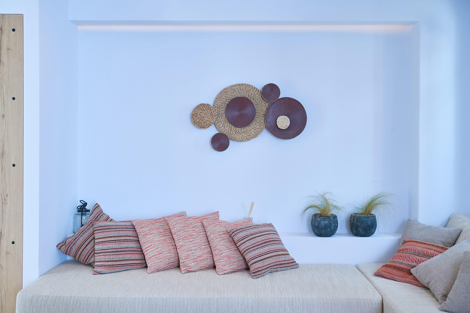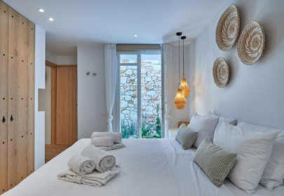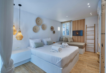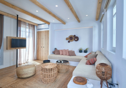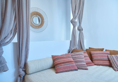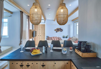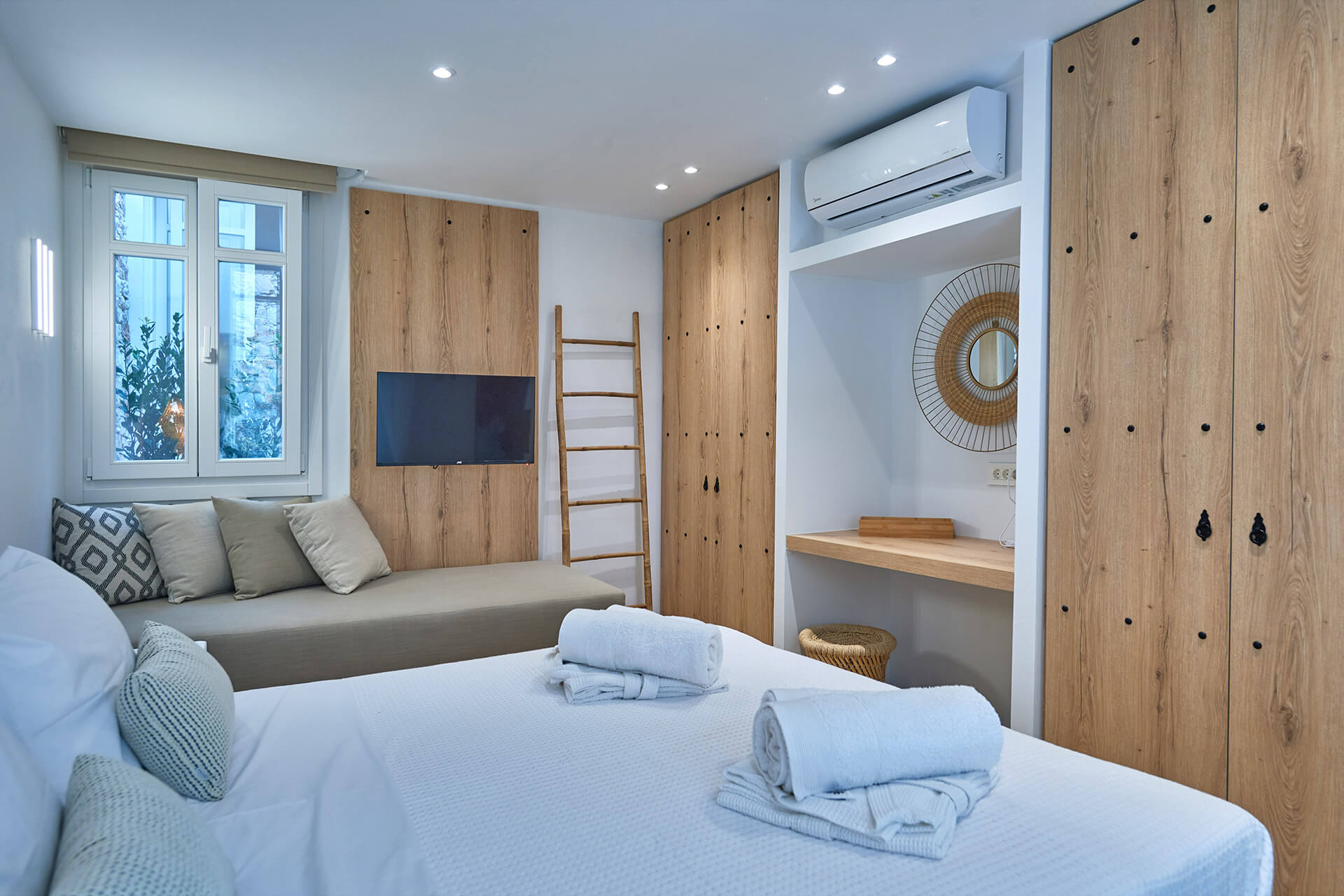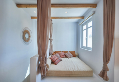 Bamboo, wooden elements, white and dark surfaces, and beautiful Cycladic windows combine modern aesthetics with island tradition to create a cinematic landscape. Inhale the fresh Mediterranean air as you sip a refreshing cocktail, read a good book, or simply indulge in the luxury of doing nothing in your private lounge area of the terrace.