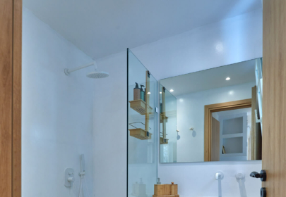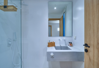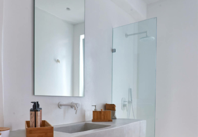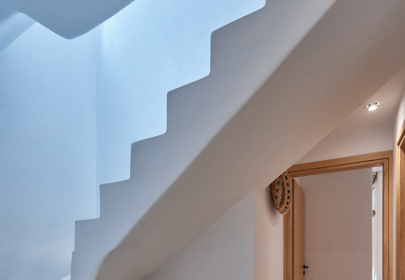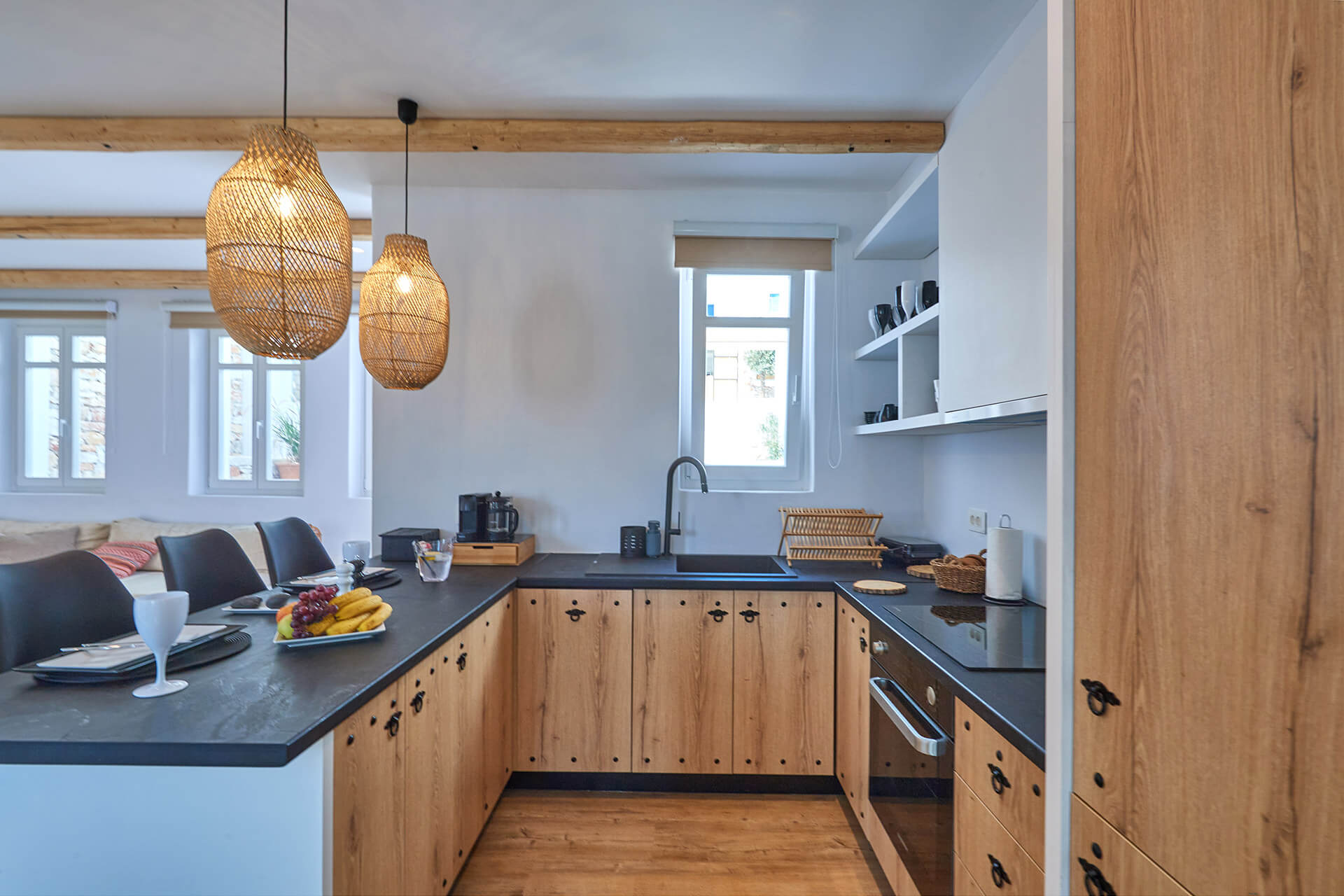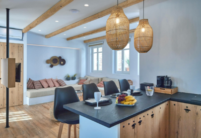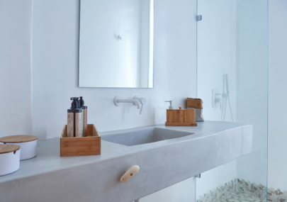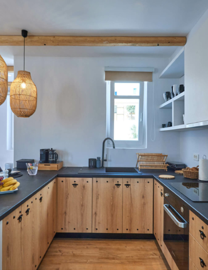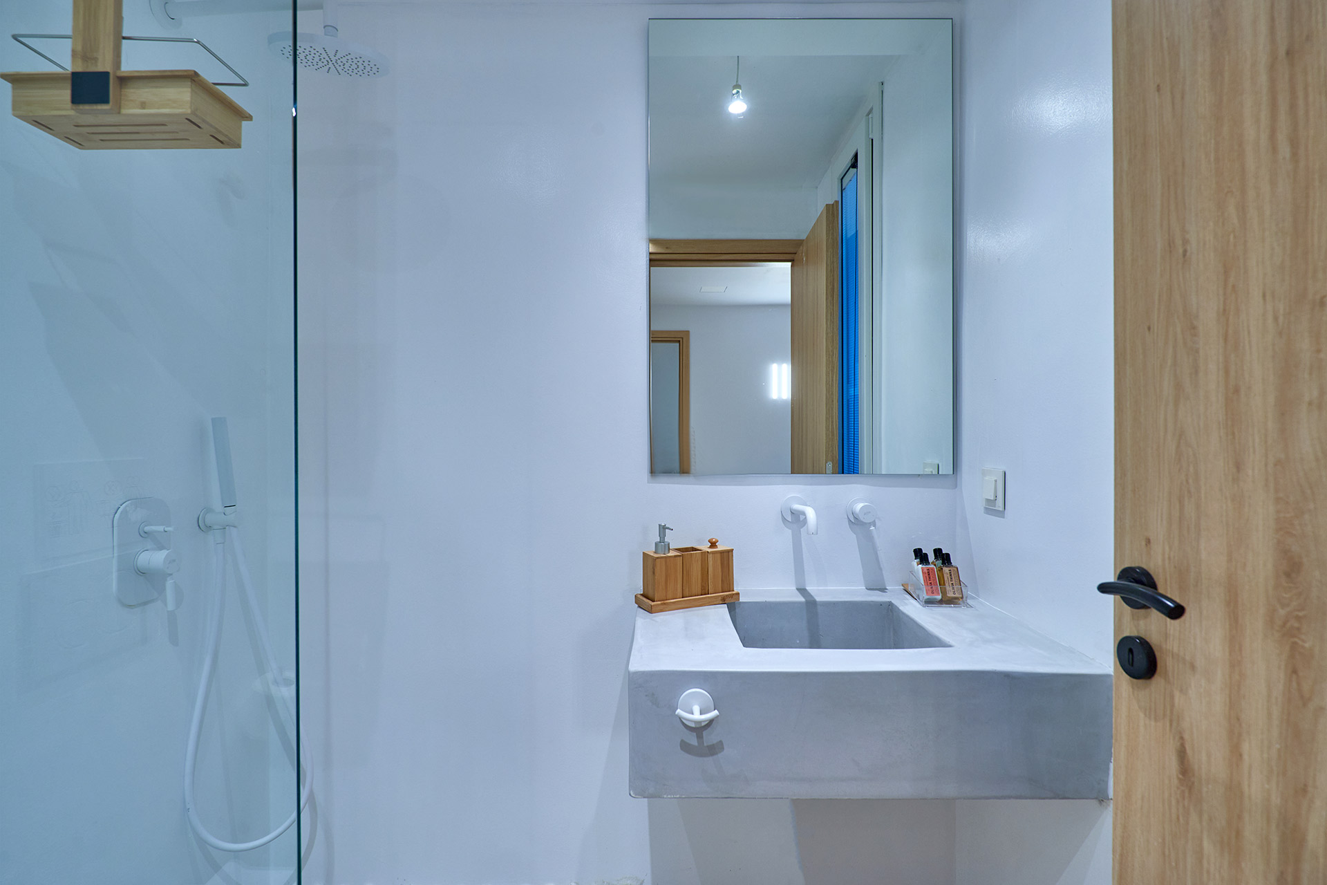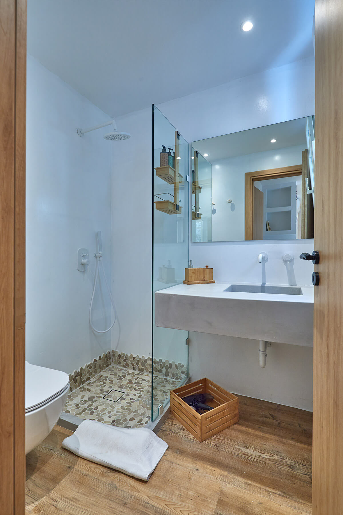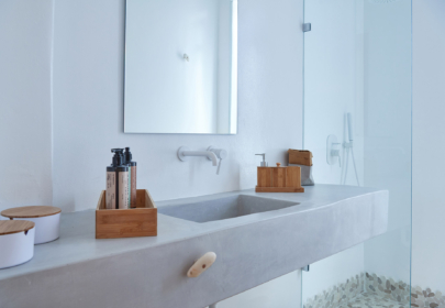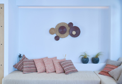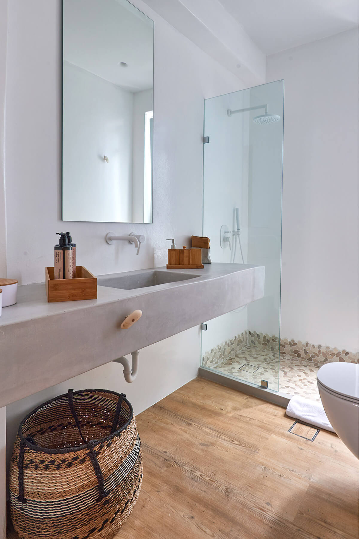 Bamboo, wooden elements, white and dark surfaces, and beautiful Cycladic windows combine modern aesthetics with island tradition to create a cinematic landscape. Inhale the fresh Mediterranean air as you sip a refreshing cocktail, read a good book, or simply indulge in the luxury of doing nothing in your private lounge area of the terrace.