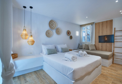 The town of Naoussa, where you will find all of the modern conveniences you need during your vacation —from shops and restaurants to cafes and banks— is just a few minutes’ walk away from the apartments. Parking spots are available outside of the complex.
