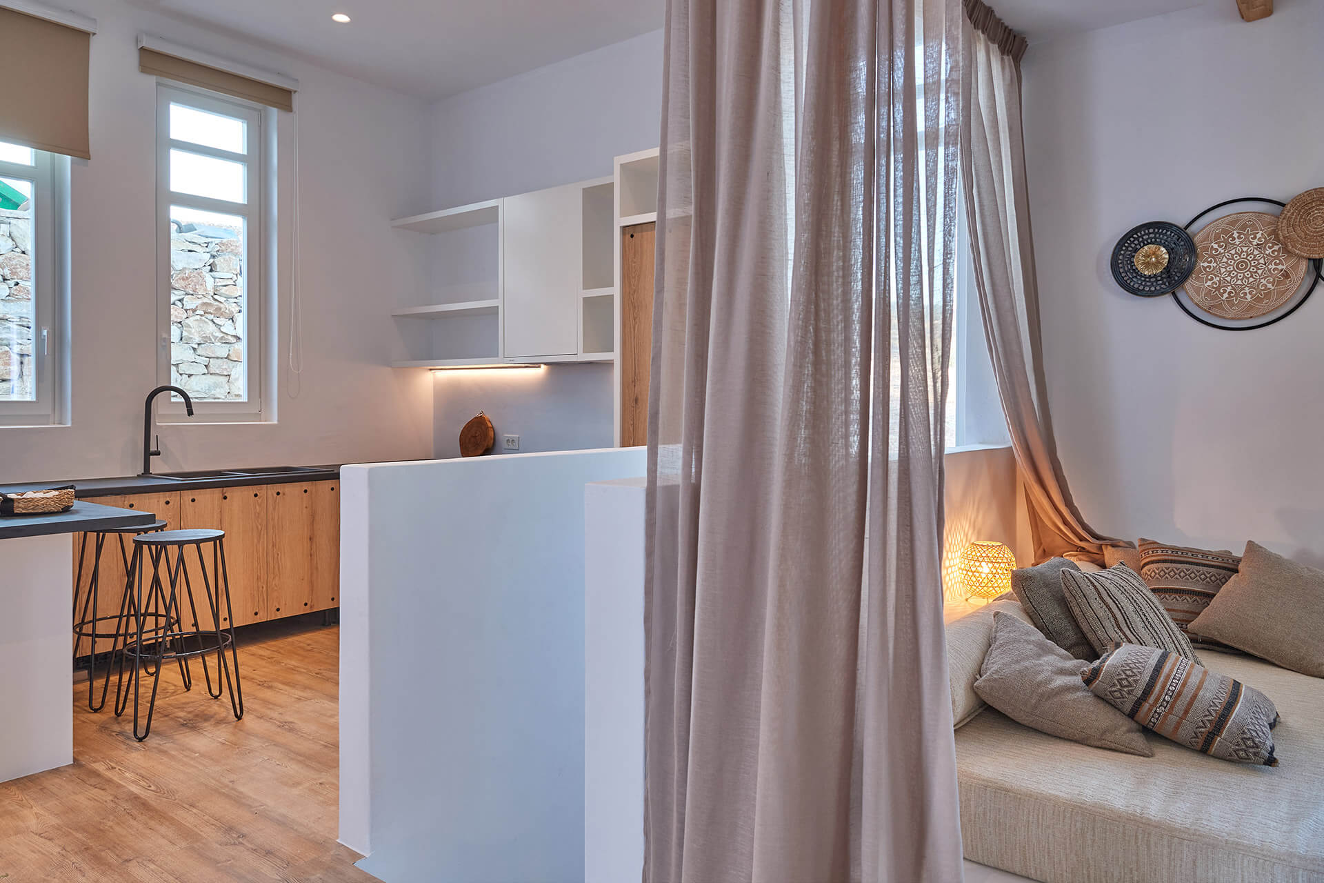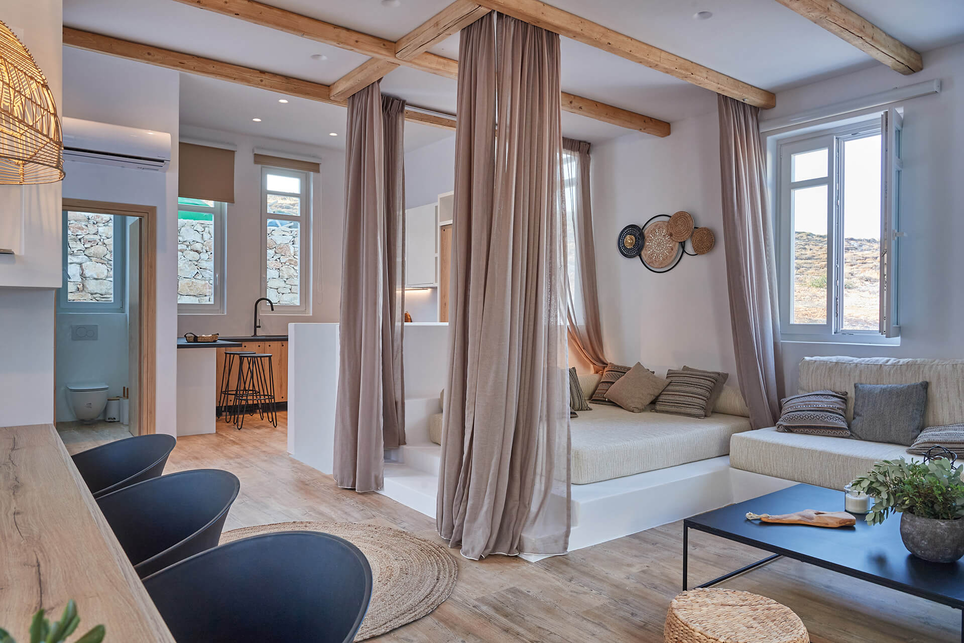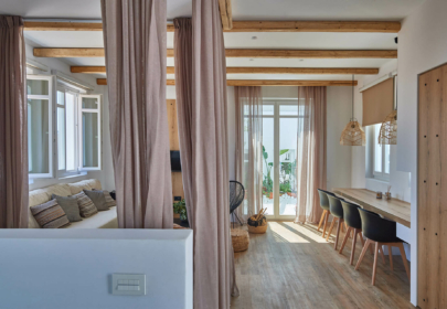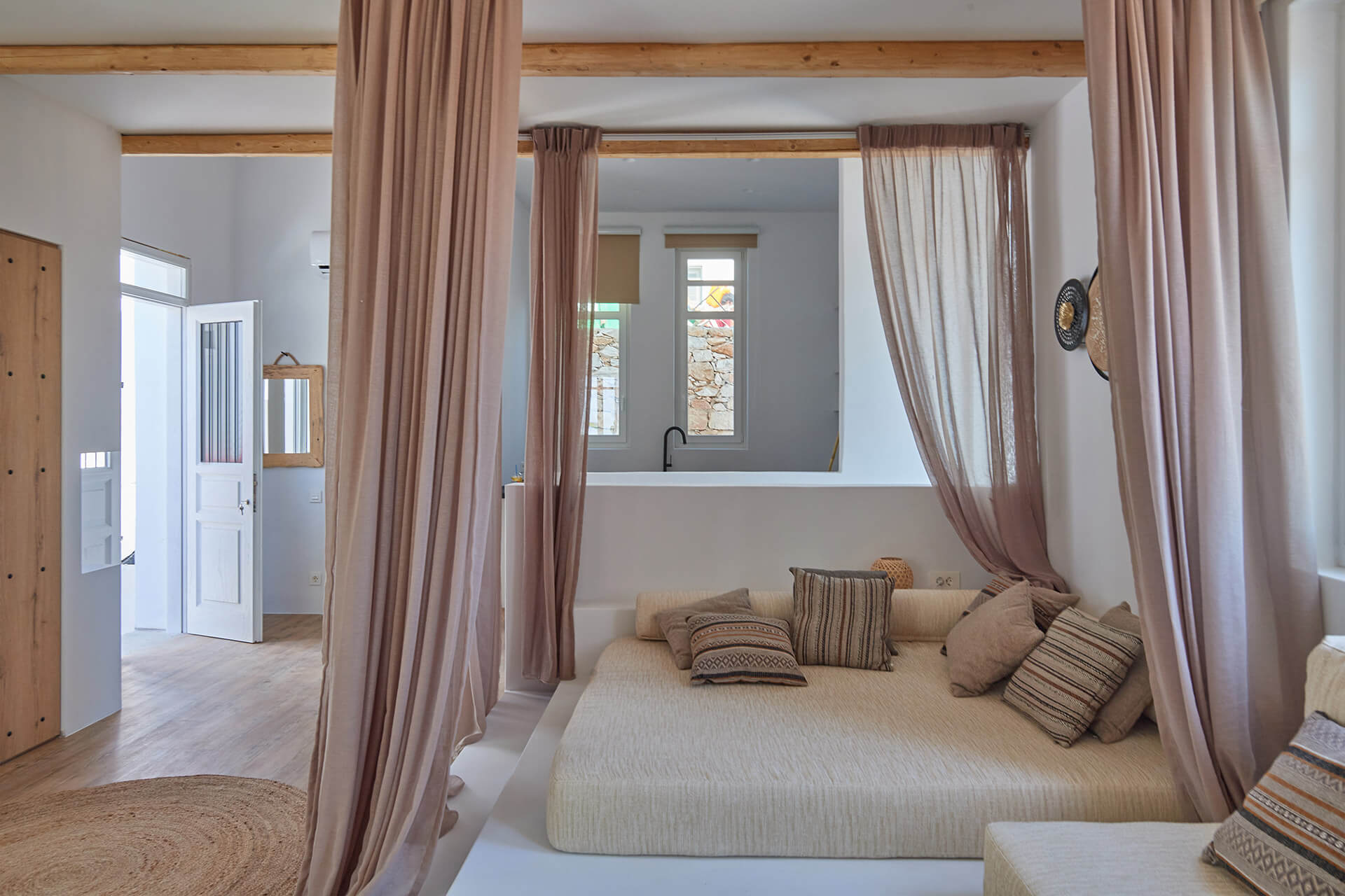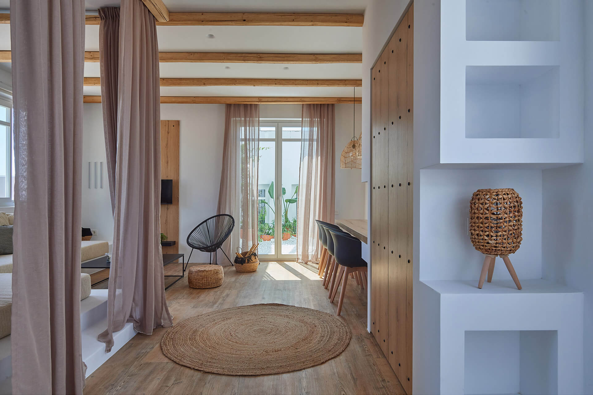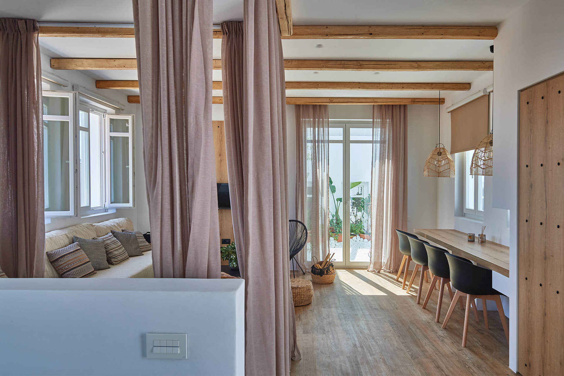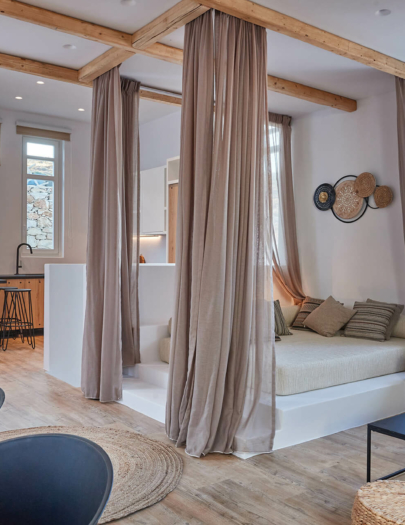 Two master bedrooms with en suite bathrooms and a relaxing area with a sofa bed and surrounding curtains, designed to accommodate up to six guests. The dominance of wood, earthy colors, and minimal decoration contribute to the tranquility of the space and make it ideal for reading, relaxation and inner wholeness.
