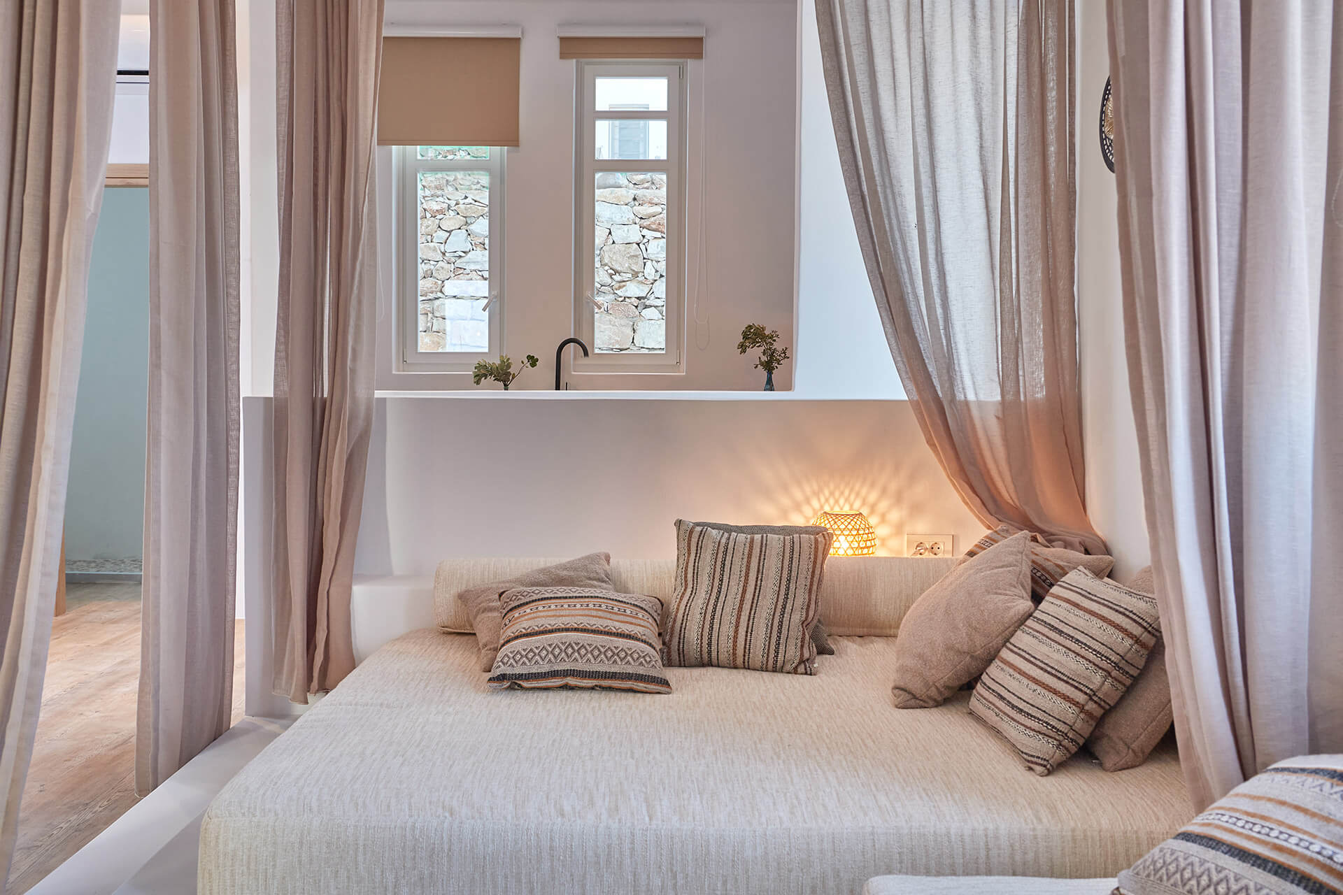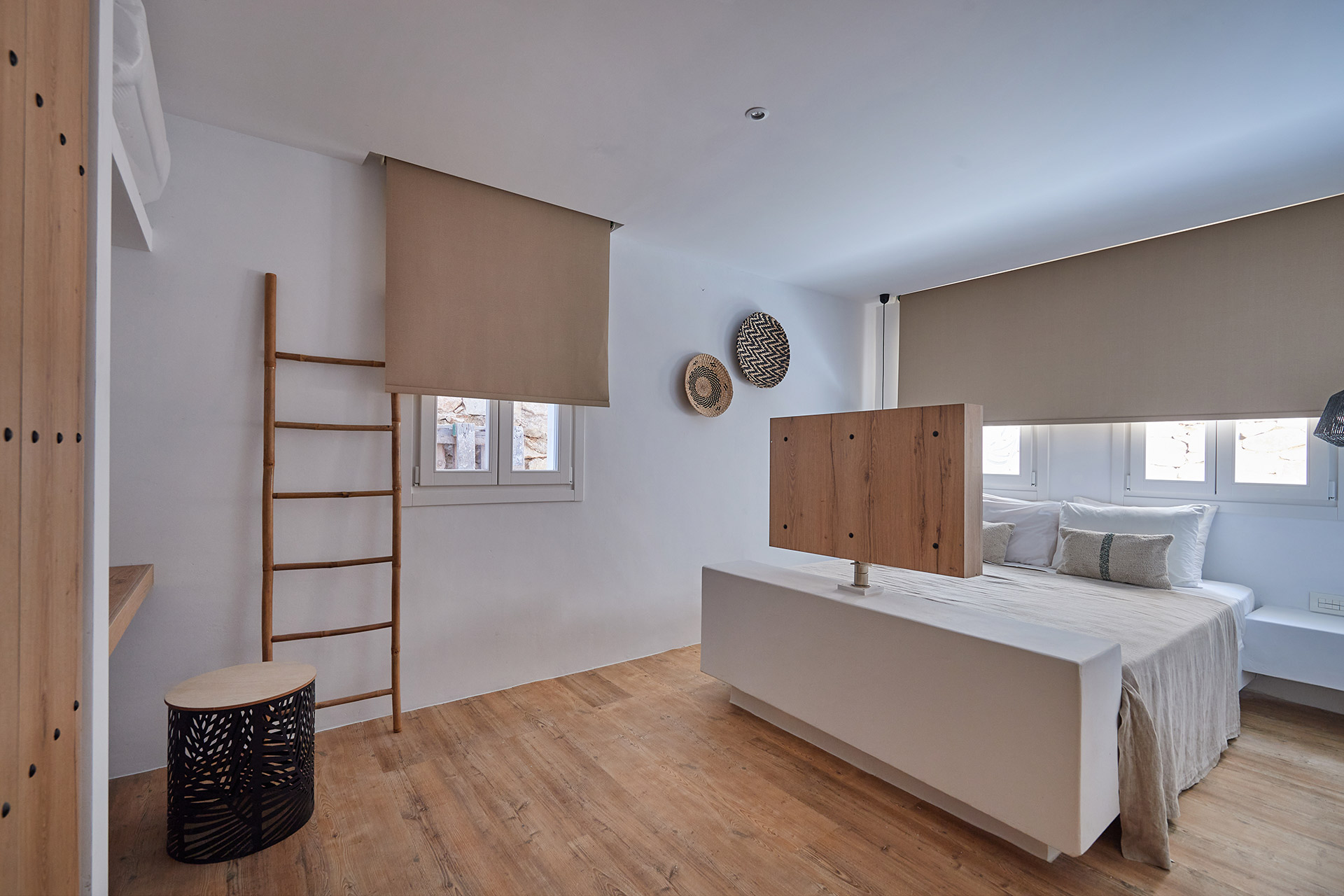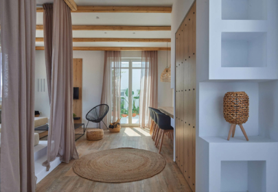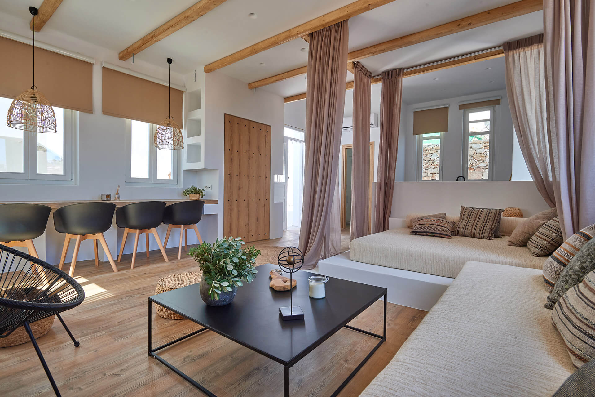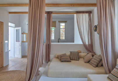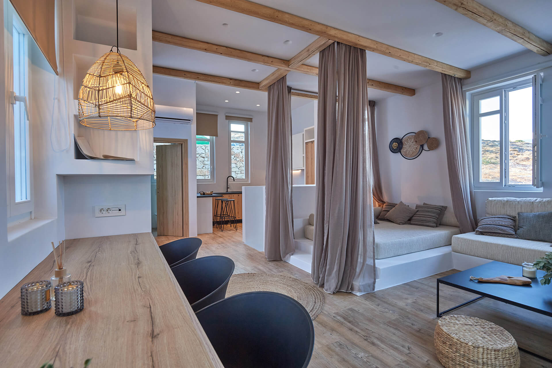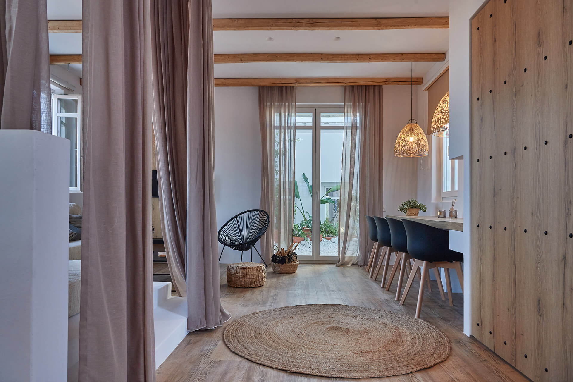 Two master bedrooms with en suite bathrooms and a relaxing area with a sofa bed and surrounding curtains, designed to accommodate up to six guests. The dominance of wood, earthy colors, and minimal decoration contribute to the tranquility of the space and make it ideal for reading, relaxation and inner wholeness.