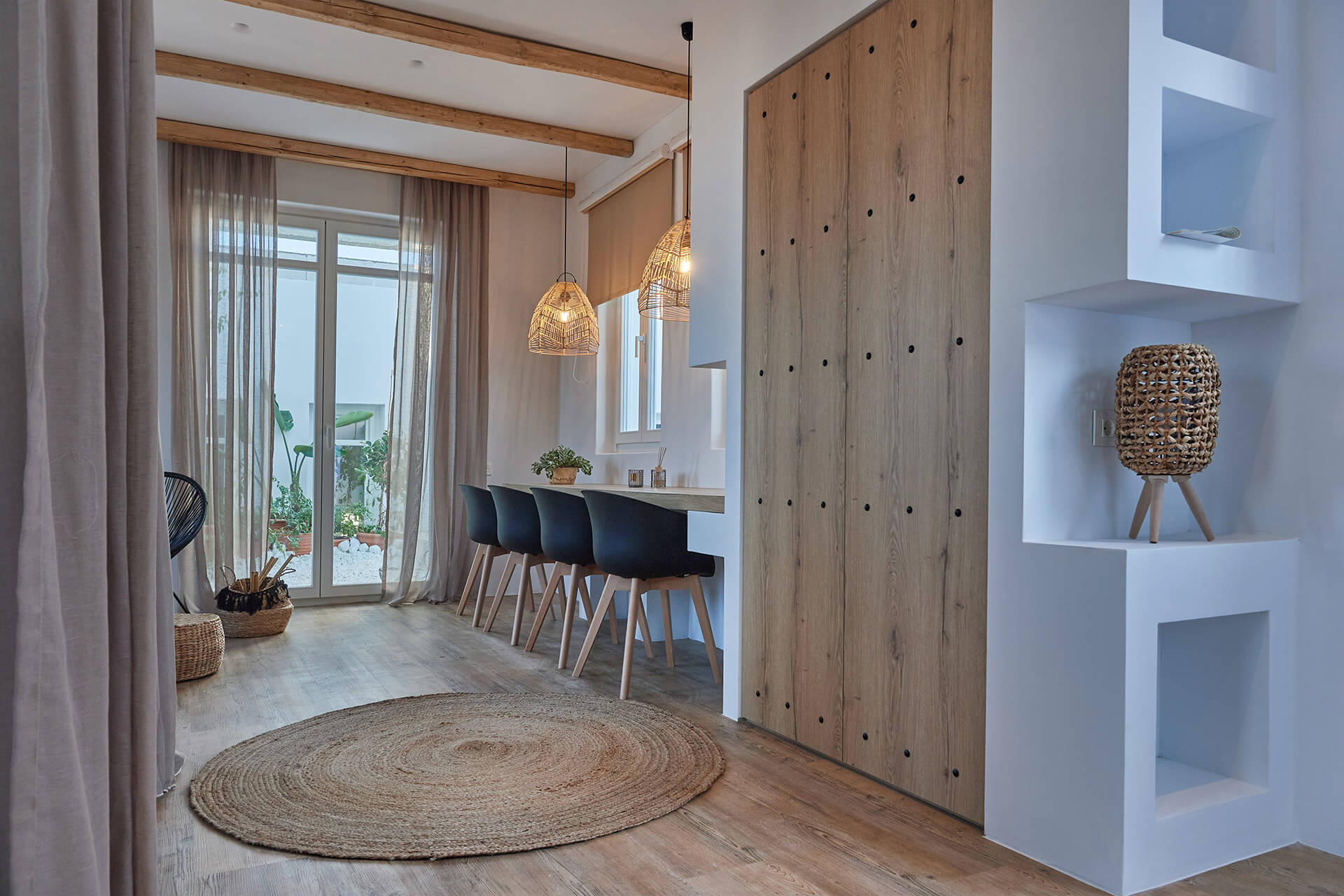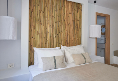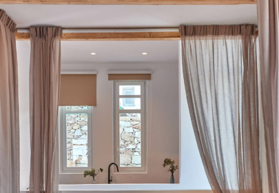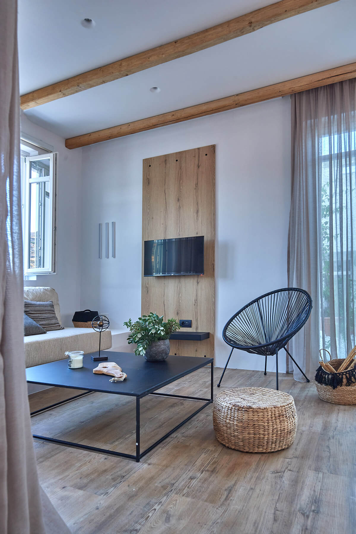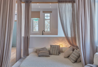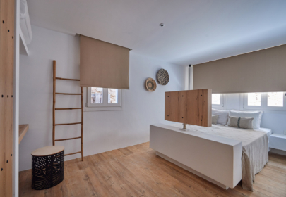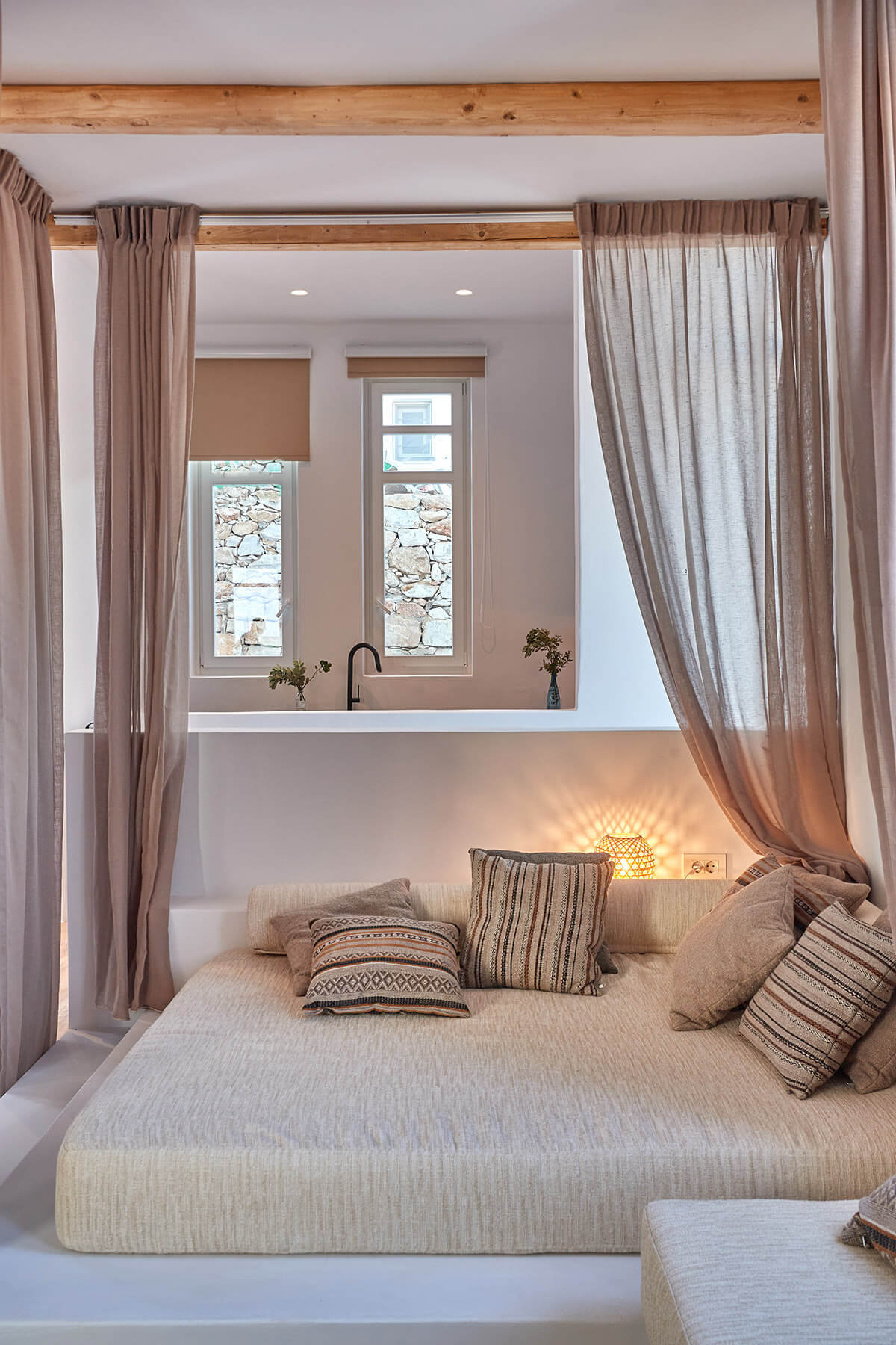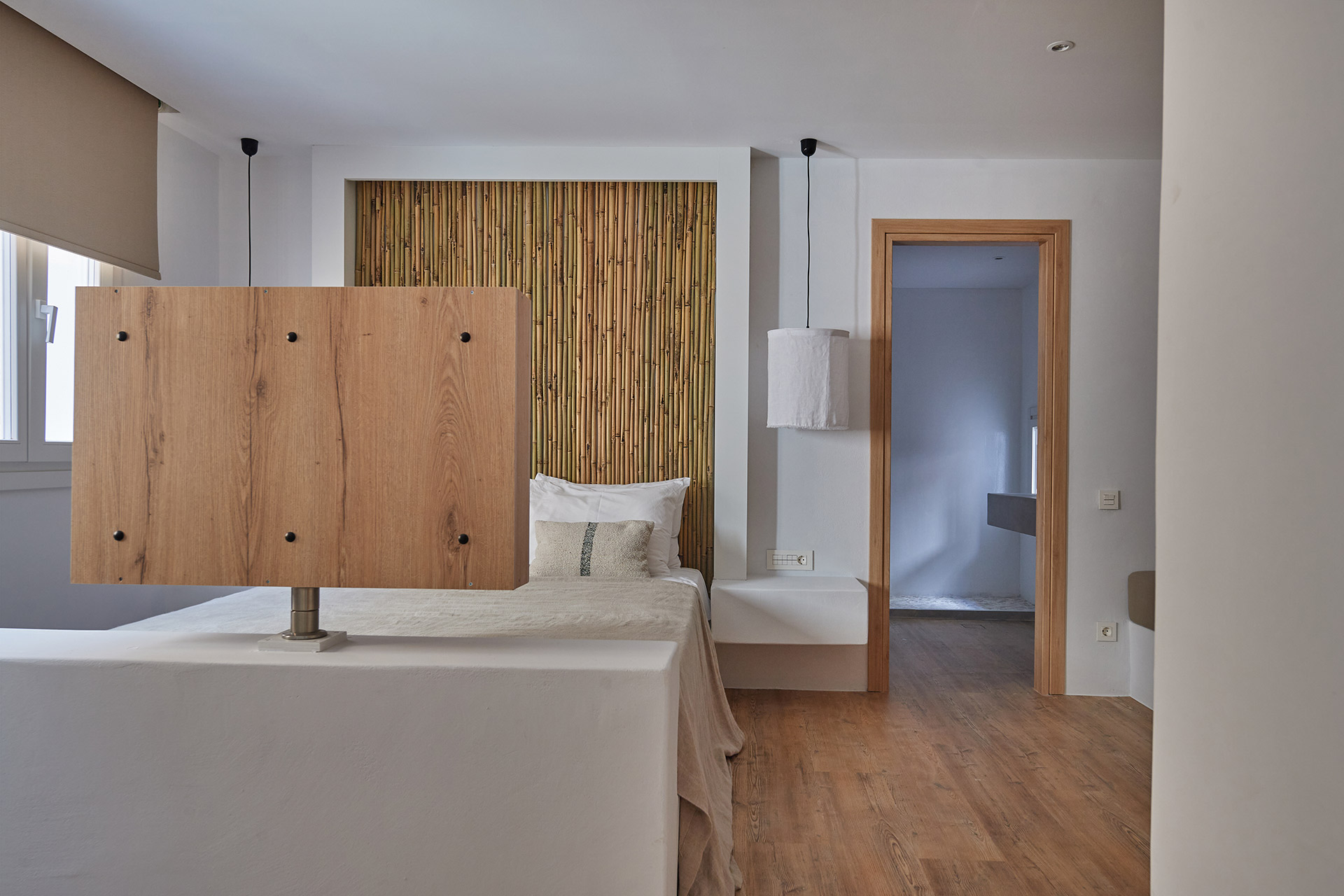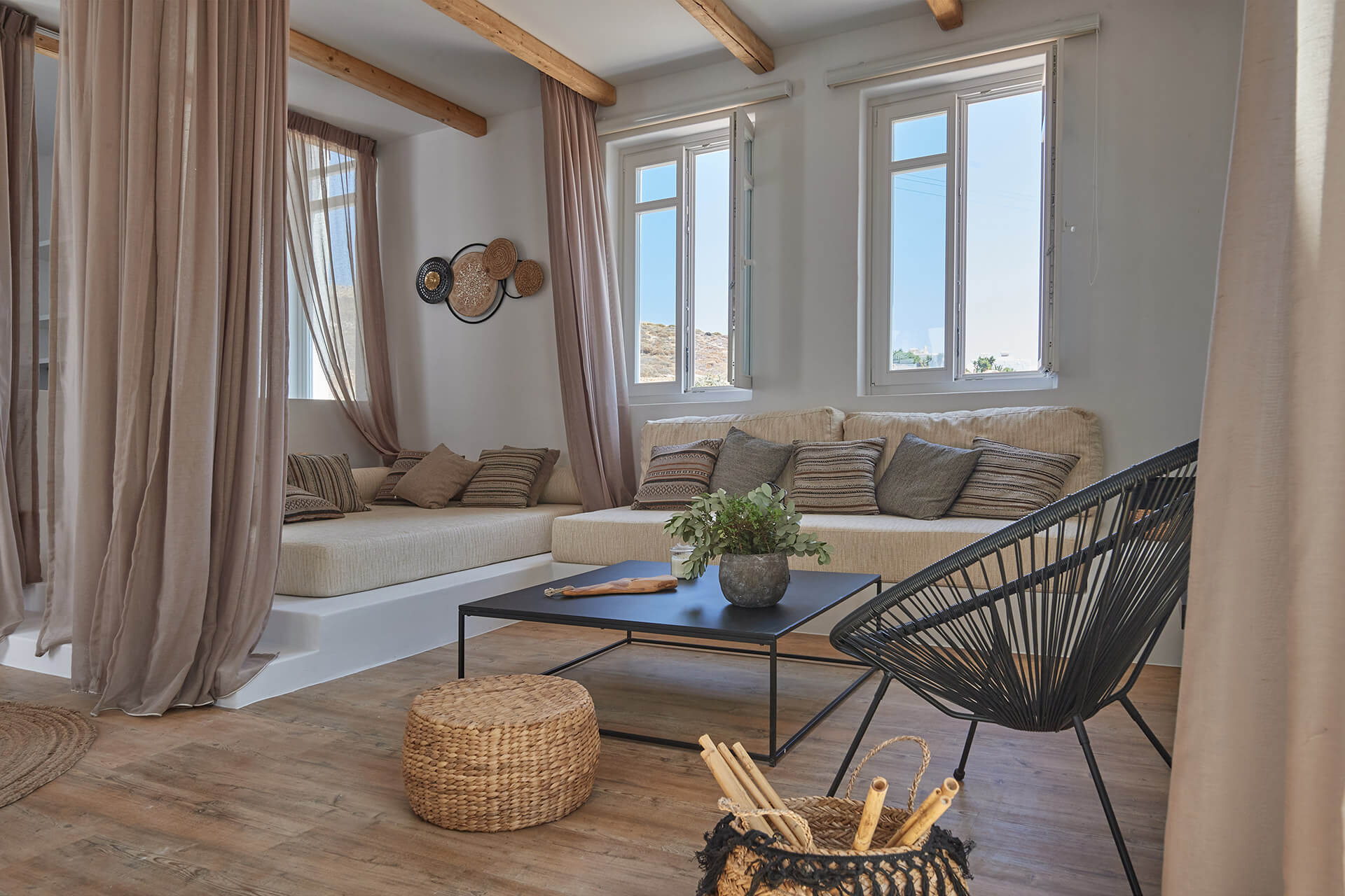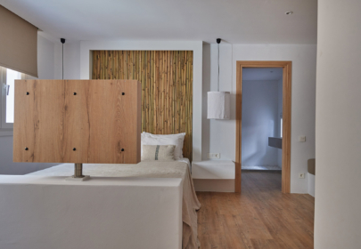 Two master bedrooms with en suite bathrooms and a relaxing area with a sofa bed and surrounding curtains, designed to accommodate up to six guests. The dominance of wood, earthy colors, and minimal decoration contribute to the tranquility of the space and make it ideal for reading, relaxation and inner wholeness.