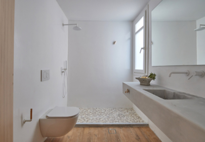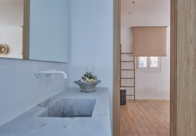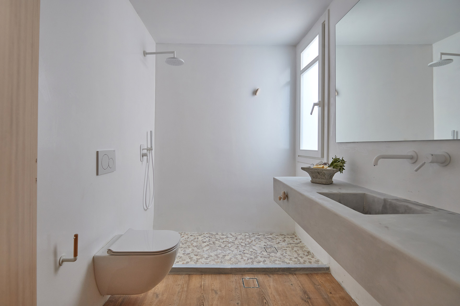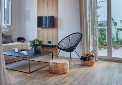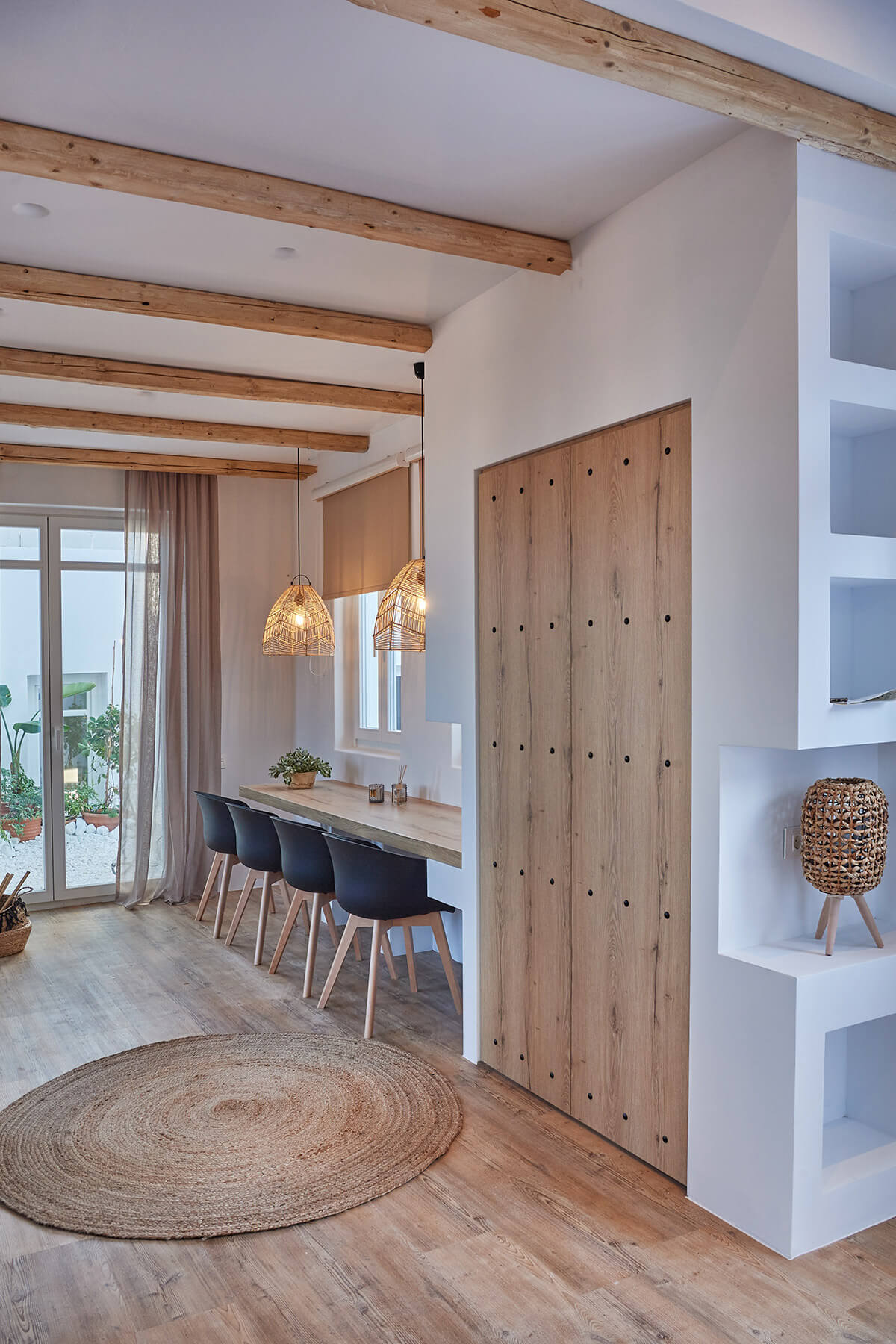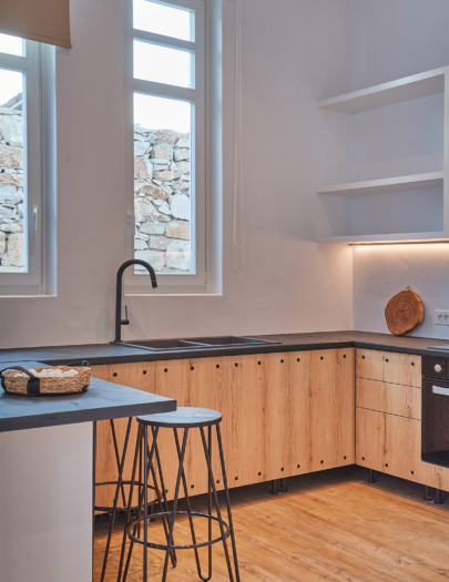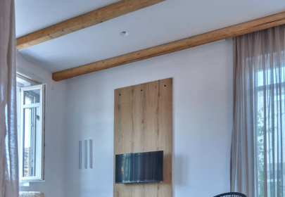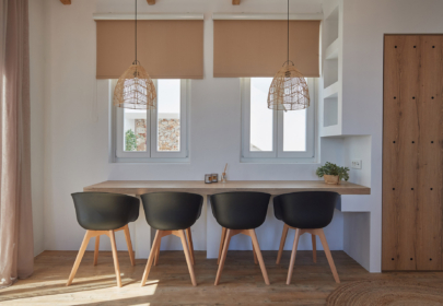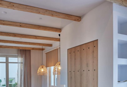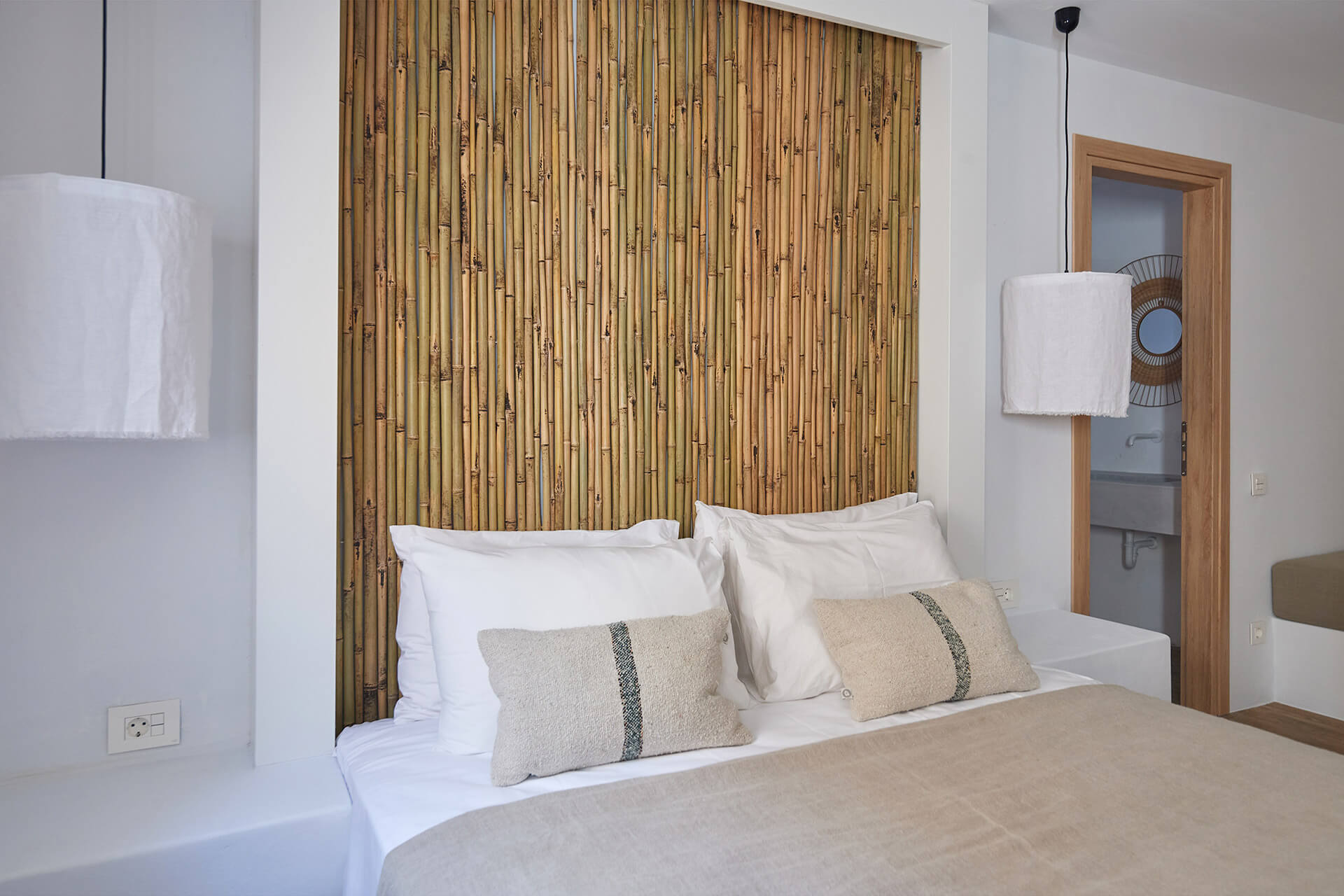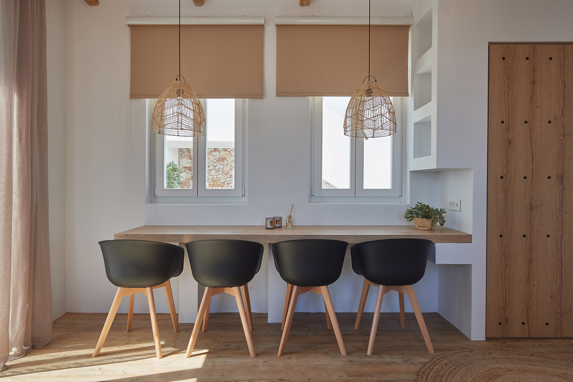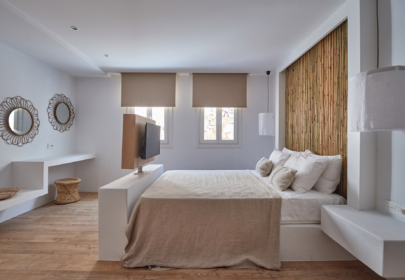 Two master bedrooms with en suite bathrooms and a relaxing area with a sofa bed and surrounding curtains, designed to accommodate up to six guests. The dominance of wood, earthy colors, and minimal decoration contribute to the tranquility of the space and make it ideal for reading, relaxation and inner wholeness.
