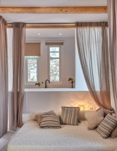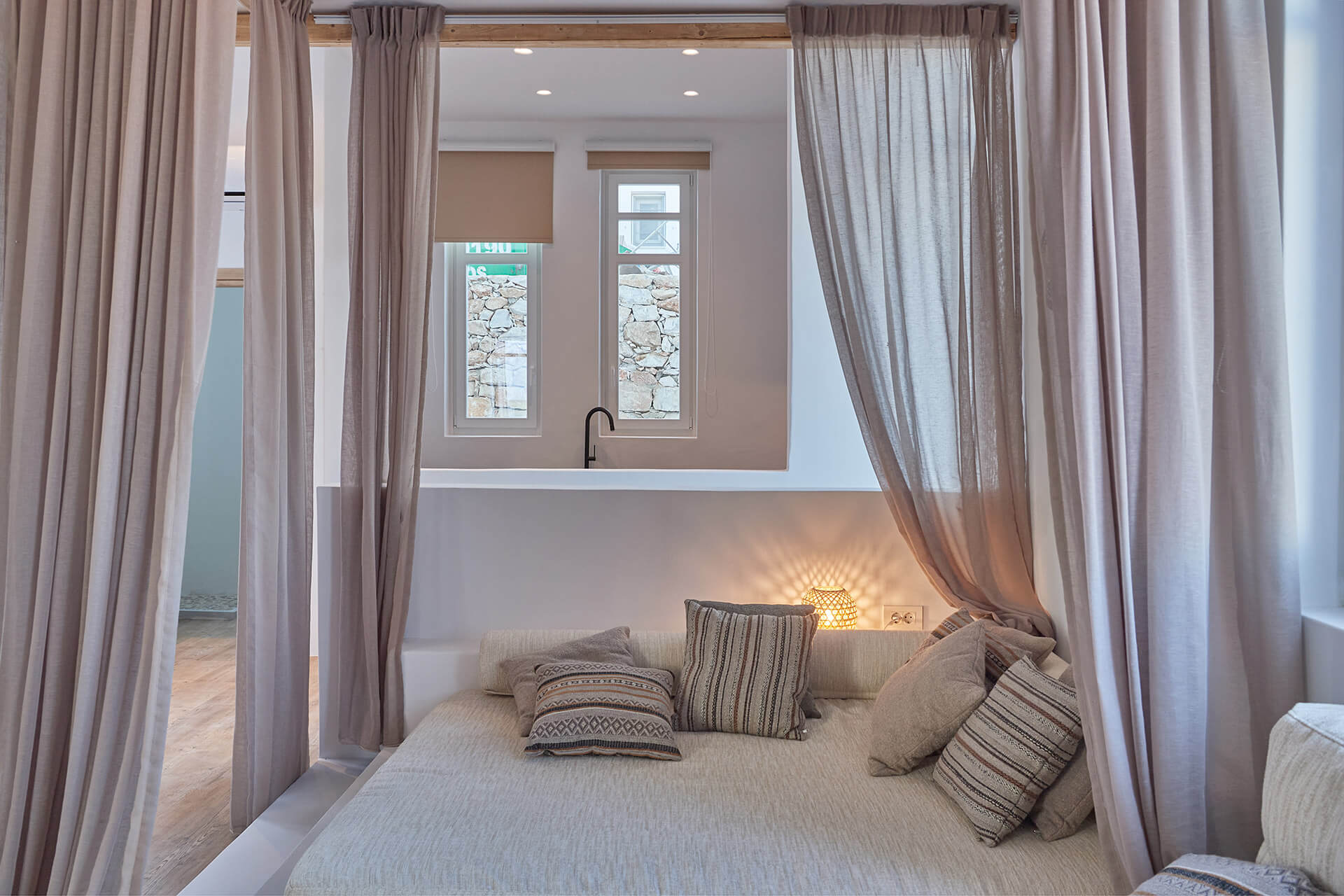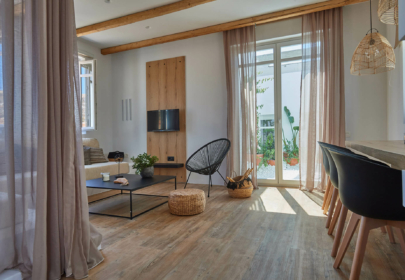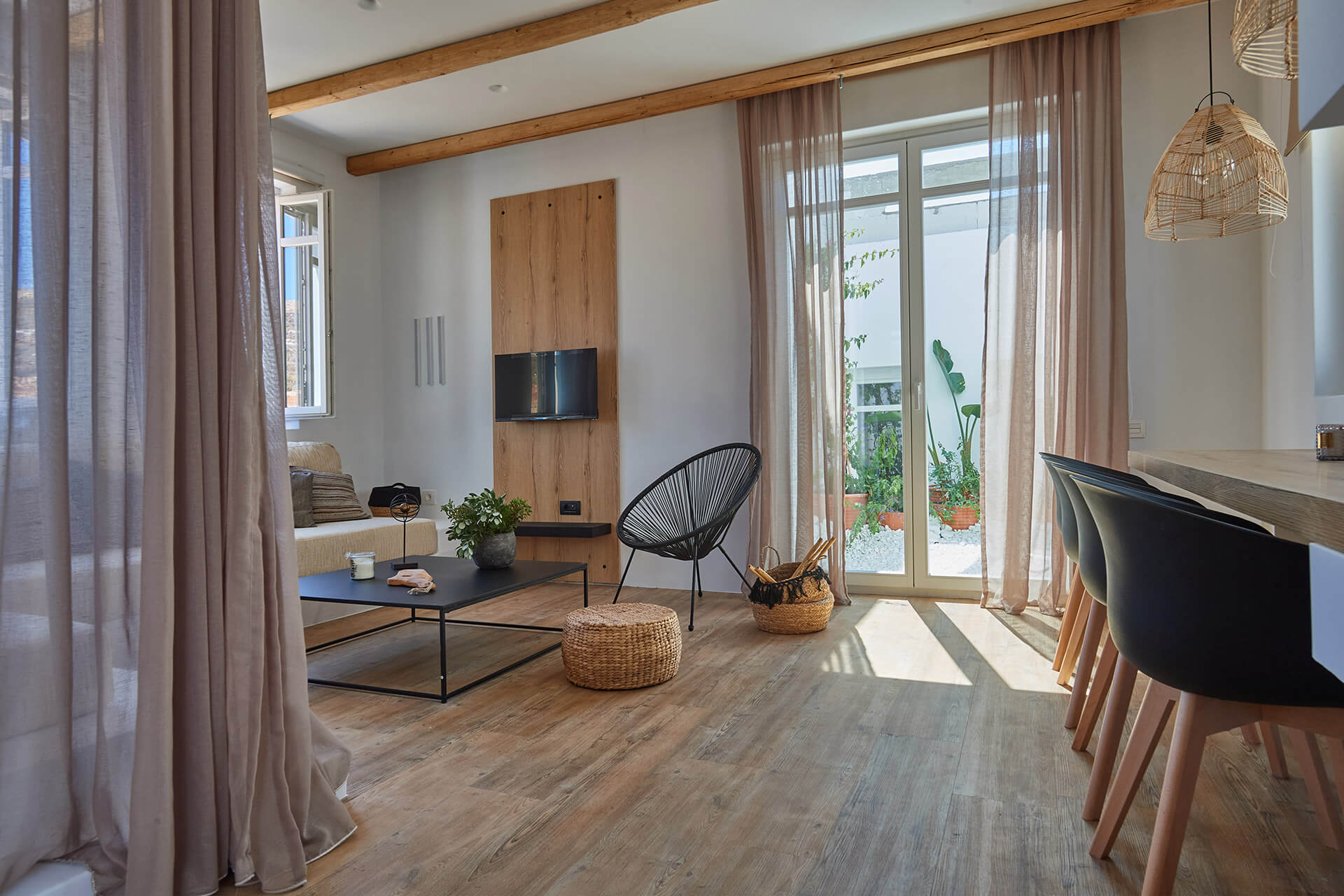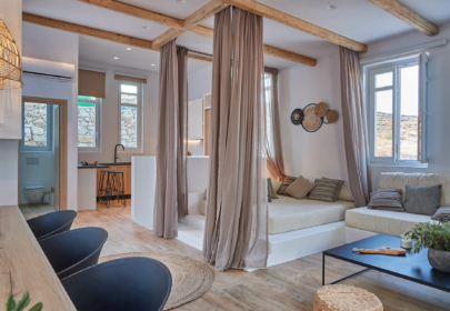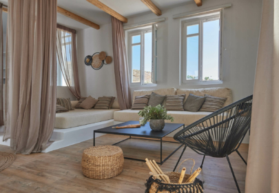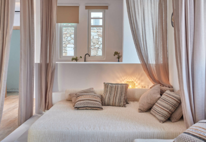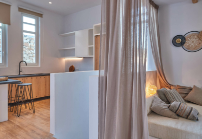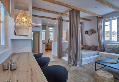 Contemporary and sophisticated apartment in the heart of Naoussa, within a luxury complex of four maisonettes with a shared terrace, but with complete privacy in the lounge area and jacuzzi.